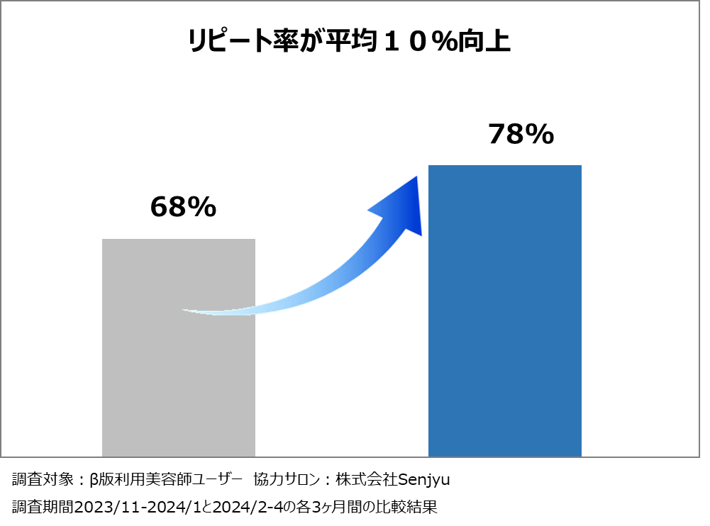 「i Producer」を活用する美容師において、平均して10%以上のリピート率向上が確認されました。美容院の課題であるリピート率向上において、重要な改善であり、AI技術の有効性を示唆しています。