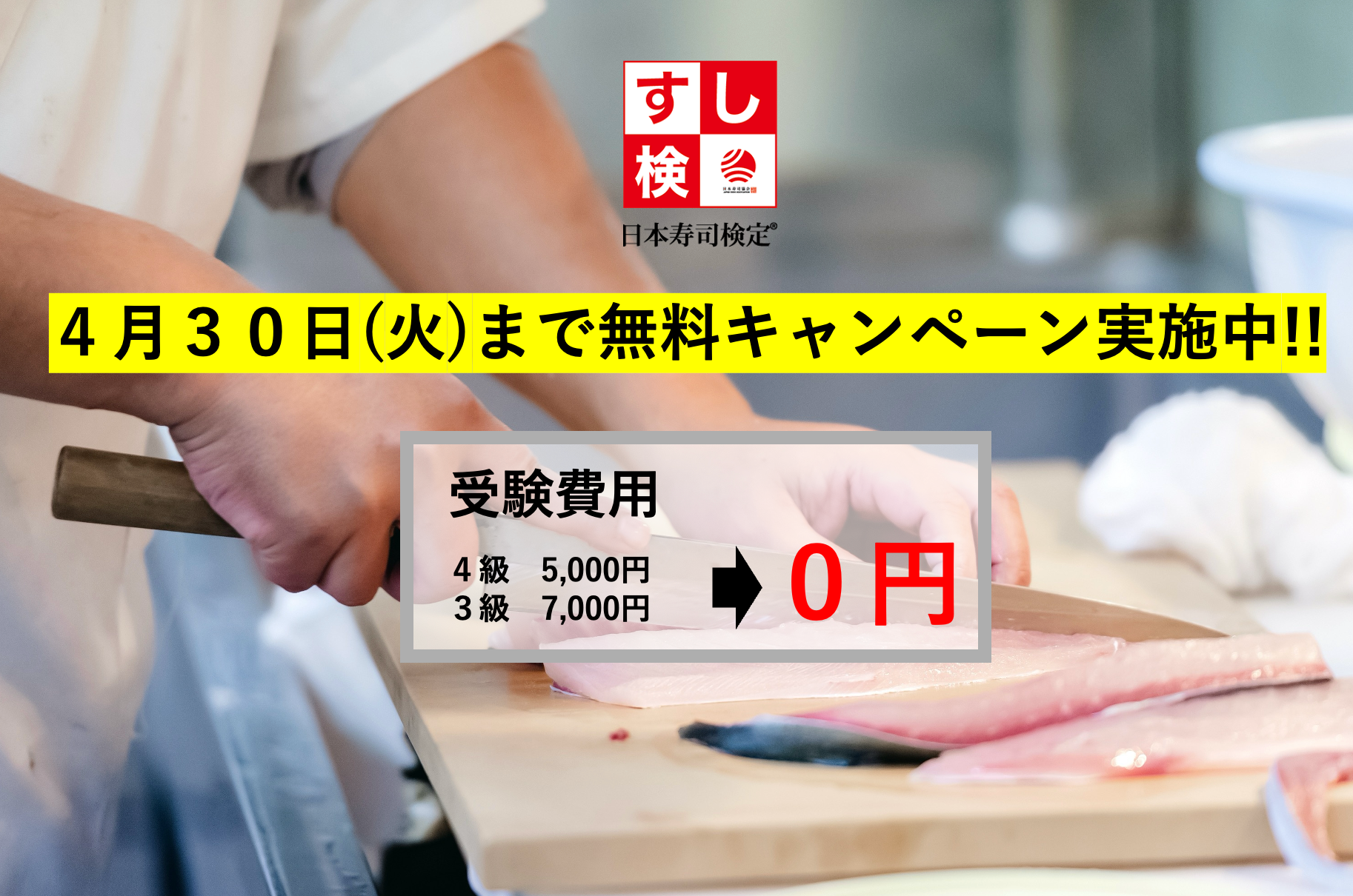一般社団法人日本寿司協会(本社:東京都港区、代表理事:池坊保子)は2024年4月6日(土)〜4月30日(火)に「日本寿司検定®」(通称:すし検®)の3級と4級の受検費用を無料にて開催することを決定しました。(すし検®公式サイト:https://sushiken.or.jp/)