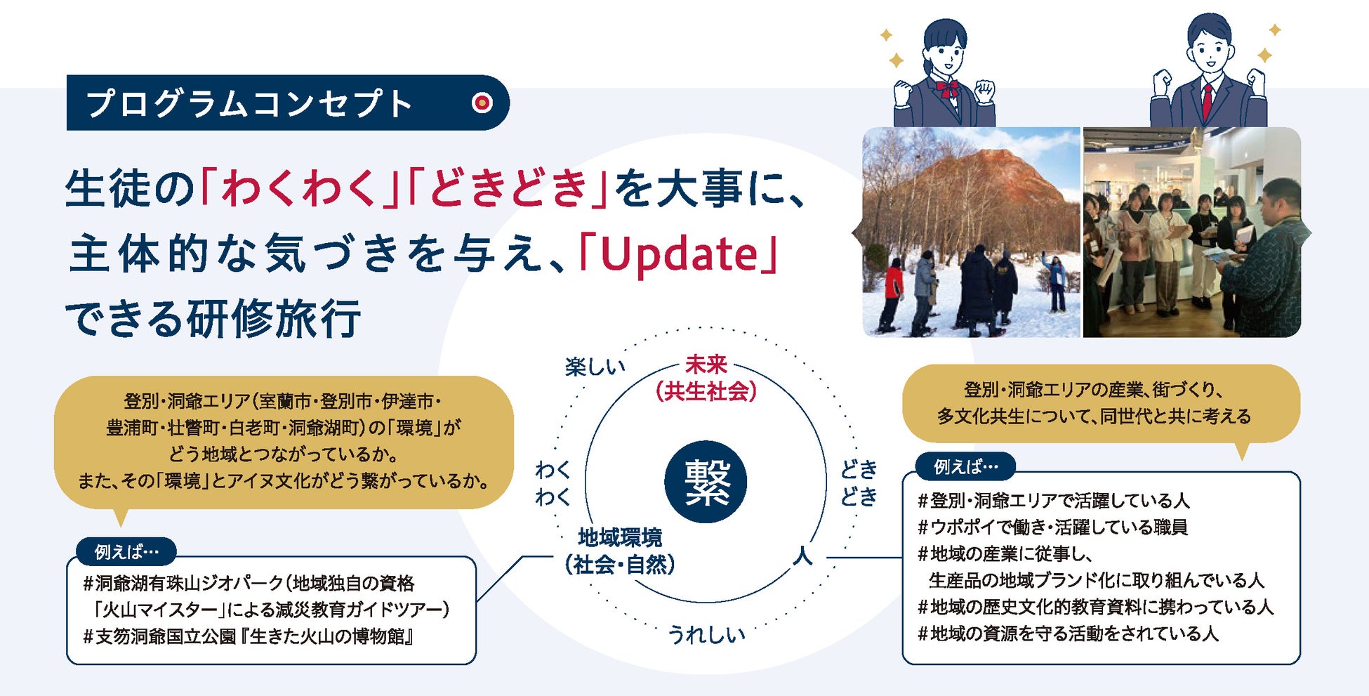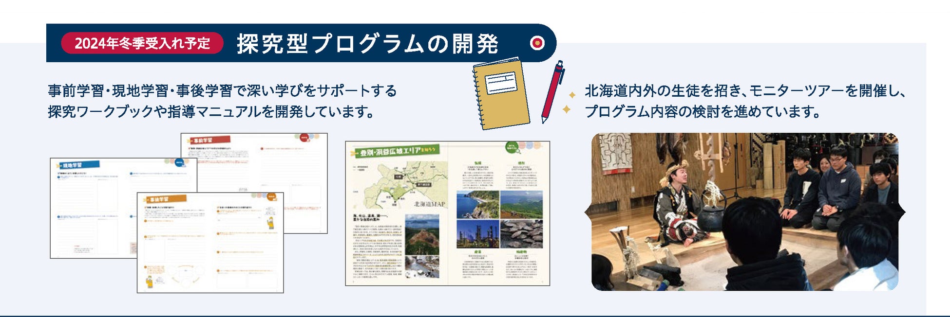2020年7月に北海道白老町にオープンした、「ウポポイ(民族共生象徴空間)」では、先住民族アイヌの歴史や文化を学び体験できる、国立アイヌ民族博物館や国立民族共生公園を拠点に、ウポポイのある登別・洞爺エリアを生徒が興味を持ちそのエリアに暮らす人々との交流を通じて、自分の良さに気づき、なりたい姿を考え、作りたい未来社会、多文化共生社会の実現を探究できるような機会を提供する「冬季教育旅行プログラム」の開発を目指しています。