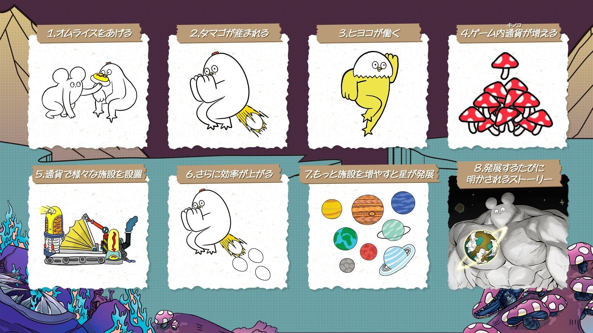 ネズミがニワトリにオムライスをあげることでたまごが産まれ、ヒヨコが孵化。さまざまなヒヨコが働くことで文明は発展していき、そのたびに新しいストーリーが明かされる。