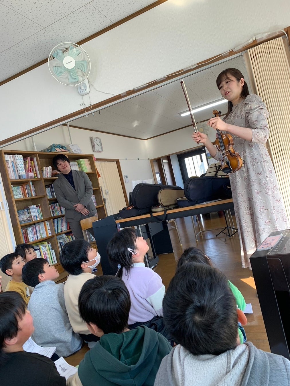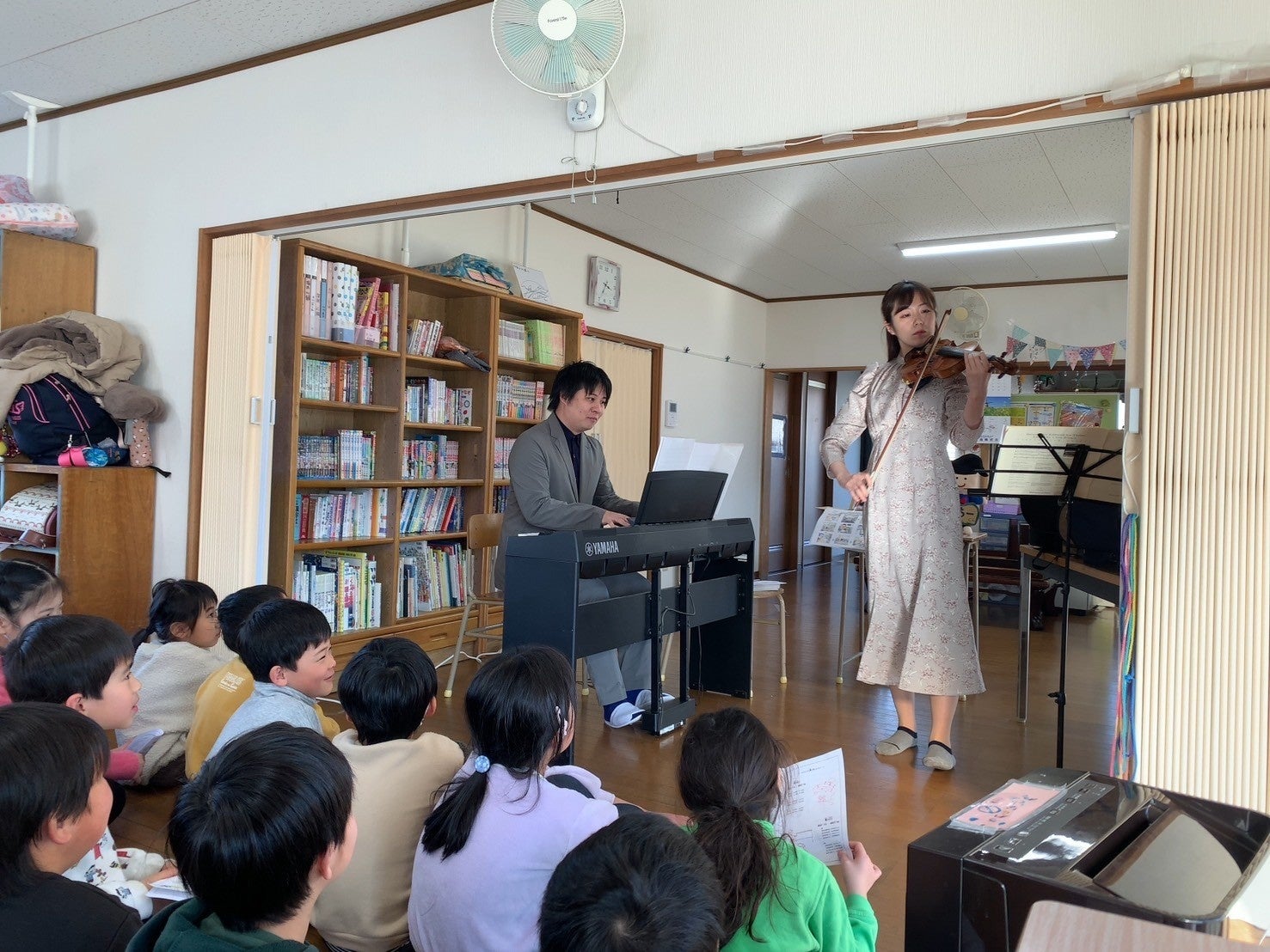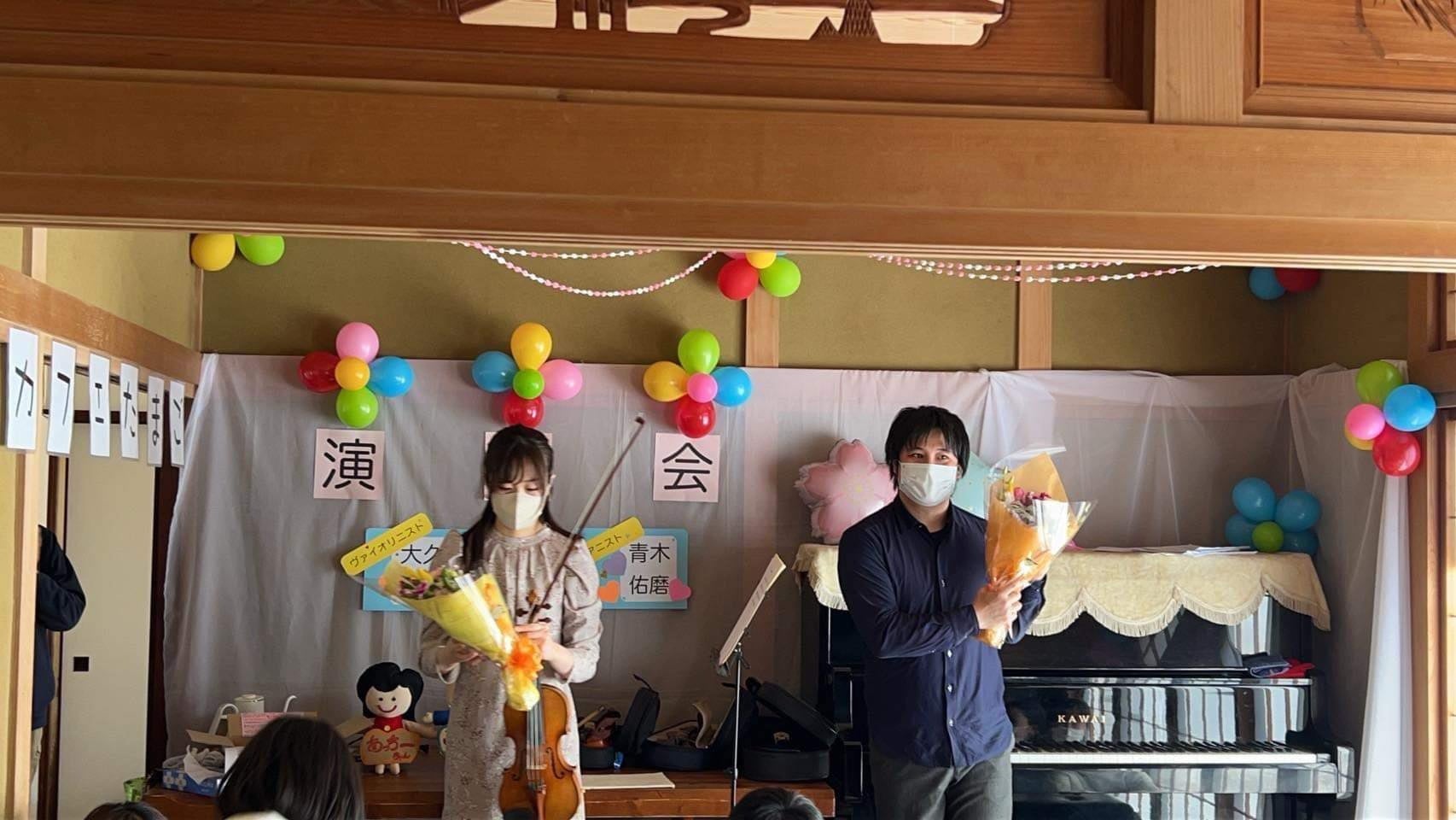 初日の3月7日、福島県郡山市の学童保育ココネット・マムで開催されたカフェ・コンサートには、約30人の子供たちが集まりました。石巻出身のバイオリニストである大久保初音さんといわき出身のピアニストである青木佑磨さんが演奏を担当し、子供たちは一緒に歌ったり、ピアノを弾いたりして音楽を楽しみました。特にバイオリン演奏の体験は、子どもたちに大人気でした。