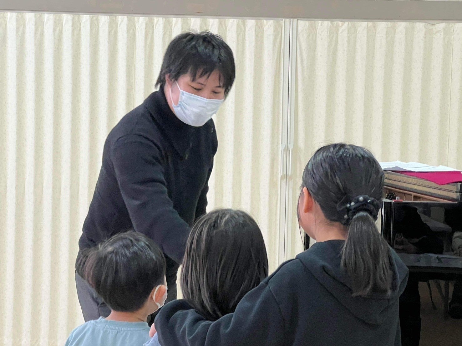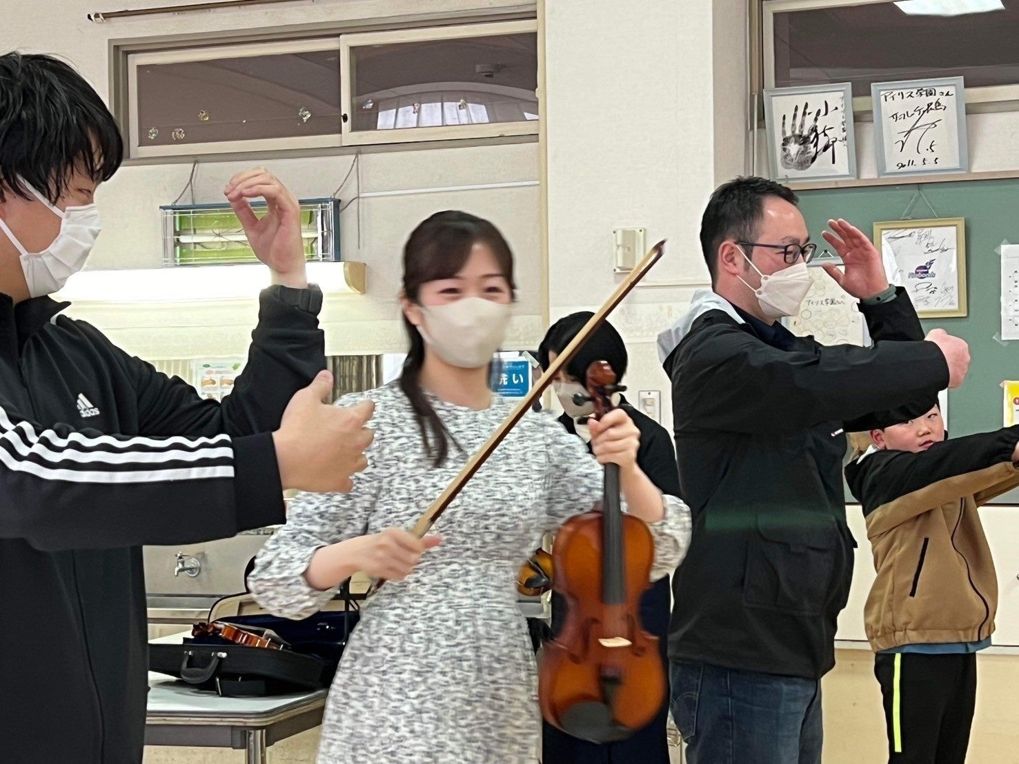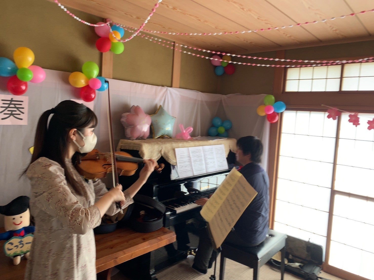 初日の3月7日、福島県郡山市の学童保育ココネット・マムで開催されたカフェ・コンサートには、約30人の子供たちが集まりました。石巻出身のバイオリニストである大久保初音さんといわき出身のピアニストである青木佑磨さんが演奏を担当し、子供たちは一緒に歌ったり、ピアノを弾いたりして音楽を楽しみました。特にバイオリン演奏の体験は、子どもたちに大人気でした。
