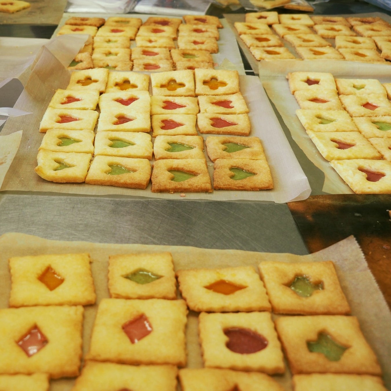 横浜でボランティア募集を「被災地にお菓子を届ける会」開催しています。被災地の方の気持ちが温かくなるように、美味しくてわあっと喜んで貰えるようなお菓子のレシピを工夫をしています。今回は「ステンドグラス・クッキー」というトランプをイメージした手作りのお菓子をボランティア16人で約200個作りました。