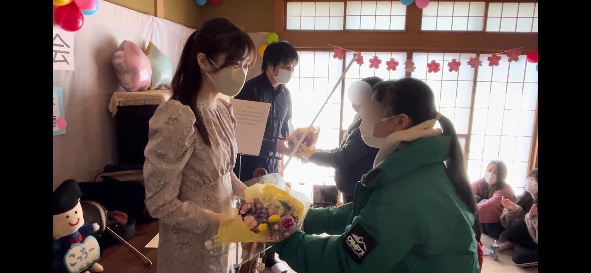 翌日の8日には福島市の児童養護施設アイリス学園で、9日には福島市のこどもカフェたまごでカフェ・コンサートが開催されました。アイリス学園では8年ぶりの訪問でしたが、子供たちは最後まで緊張しながらもバイオリン演奏を楽しんで参加し、演奏家たちとの交流も満喫しました。カフェたまごでは、子供と大人を合わせて30人以上の参加者があり、演奏開始の合図となるお菓子のCM曲で大いに盛り上がりました。アンコールには、福島出身の作曲家古関裕而の曲が演奏され、小学校を卒業する子どもたちから演奏家へ花束のサプライズがありました。