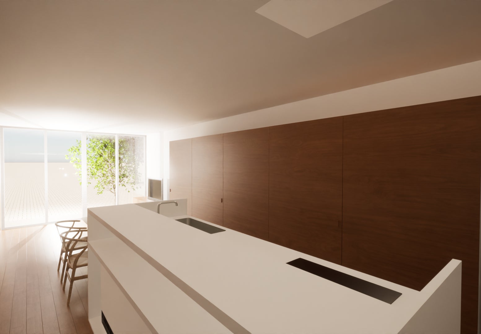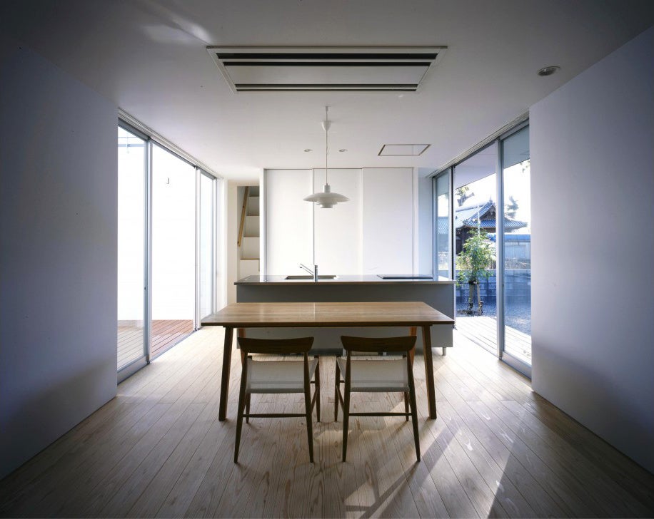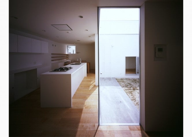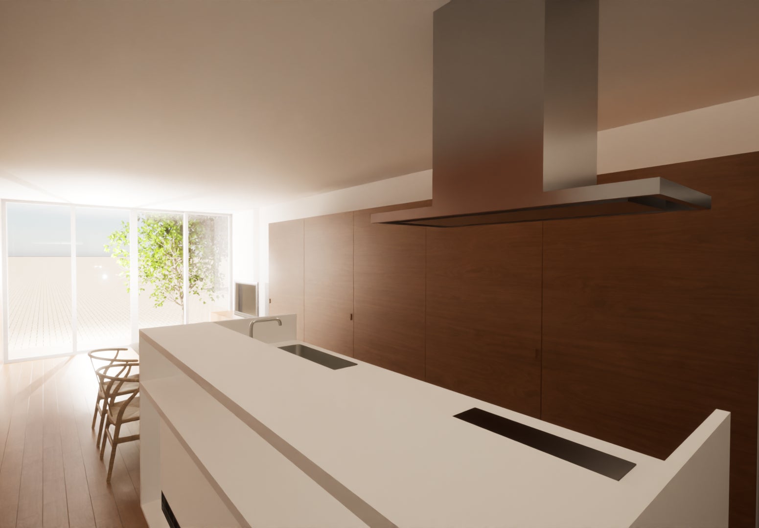 ホリベアソシエイツは、2010年に竣工した住宅設計で「天井高があまりないけれど、キッチンから見える風景をレンジフードで遮りたくない」という問題に直面しました。視界を遮らないキッチン空間を設計するにあたって着目したのは、建築士が必要な換気量の計算をして確認申請で認められれば、レンジフードは必ずしもキッチン上につけなくてもいいという点。換気扇を天井に埋め込み、天井面をフラットに見せる整流板のカバーをつけることで、料理中の油の混じった煙が一時的にでも部屋中に拡散してしまうことを防ぎつつも見た目を損なわない、新たなキッチン空間を実現しました。