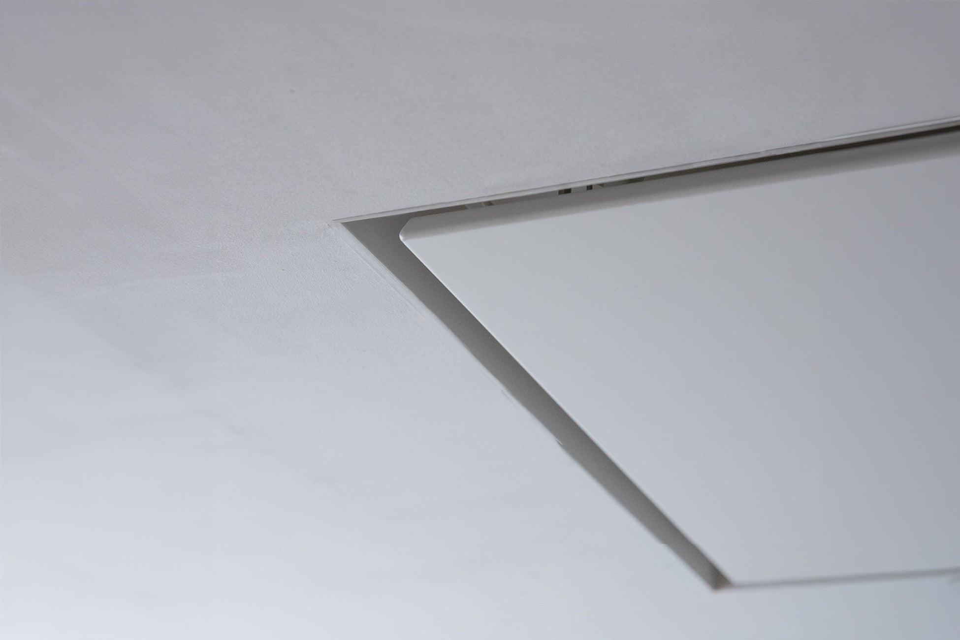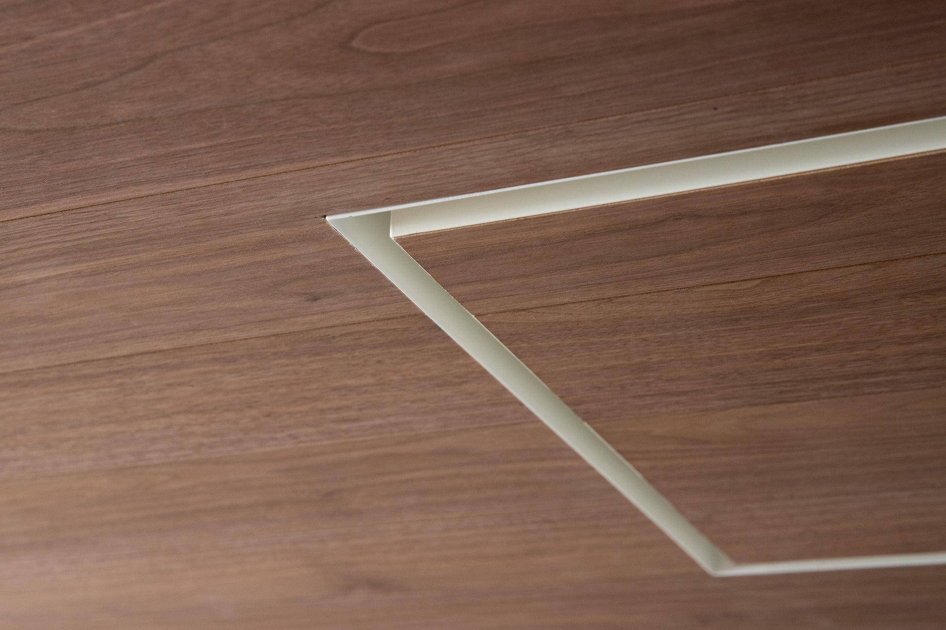 天井の開口にスチールの曲げ加工された整流板を取り付け、天井にスクエア状のスリットが見えるだけ。奥には、換気扇と点検口が納まっています。なるべくコンパクトな仕上がり寸法を実現すべく、点検口はダクトの接続が出来るギリギリのサイズに。整流板スリットは幅20mmと、見上げた時にスリットの部分から取付ラッチ金物が見えず、カバーを外す際の指掛かりを考慮した寸法です。