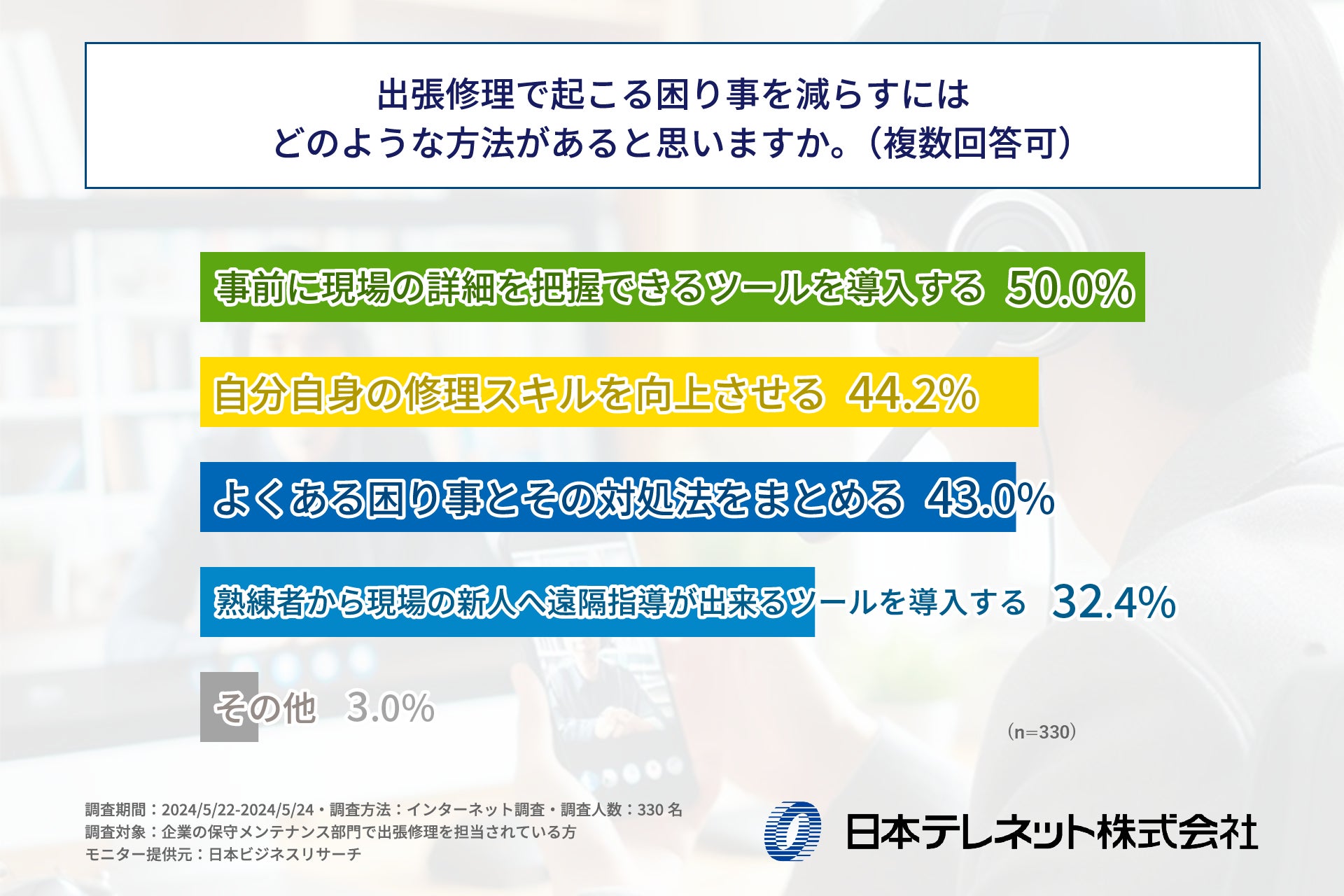 調査の最後に「出張修理で起こる困り事を減らすためにどのような方法があるか」を尋ねる設問では、1位「事前に現場の詳細を把握できるツールを導入する(50.0%)」と2位「自分自身の修理スキルを向上させる(44.2%)」、3位「よくある困り事とその対処法をまとめる(43.0%)」という回答になりました。修理スキルの習得等には一定の時間や労力がかかりますが、現場の詳細を把握できるツールなどはすぐに導入できる施策であり、現場にはそうしたものが求められていることがわかりました。