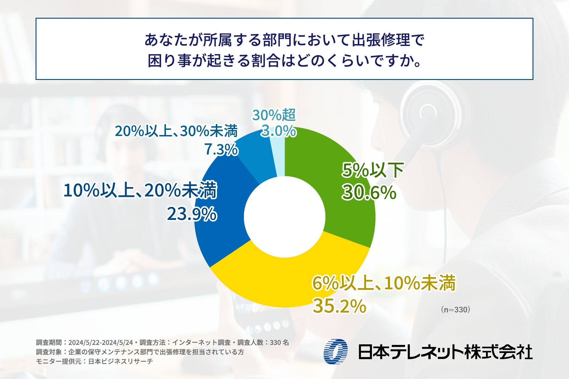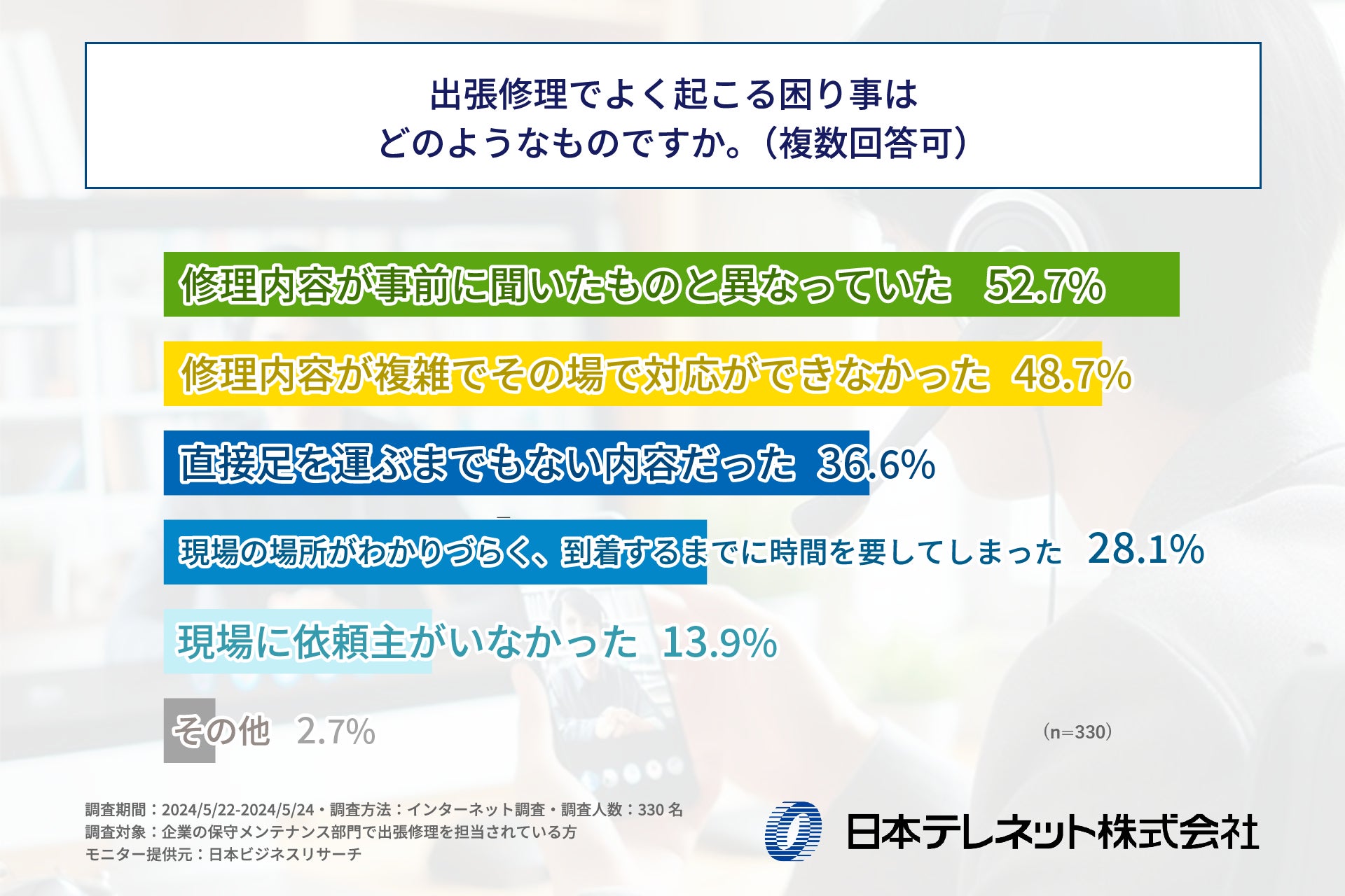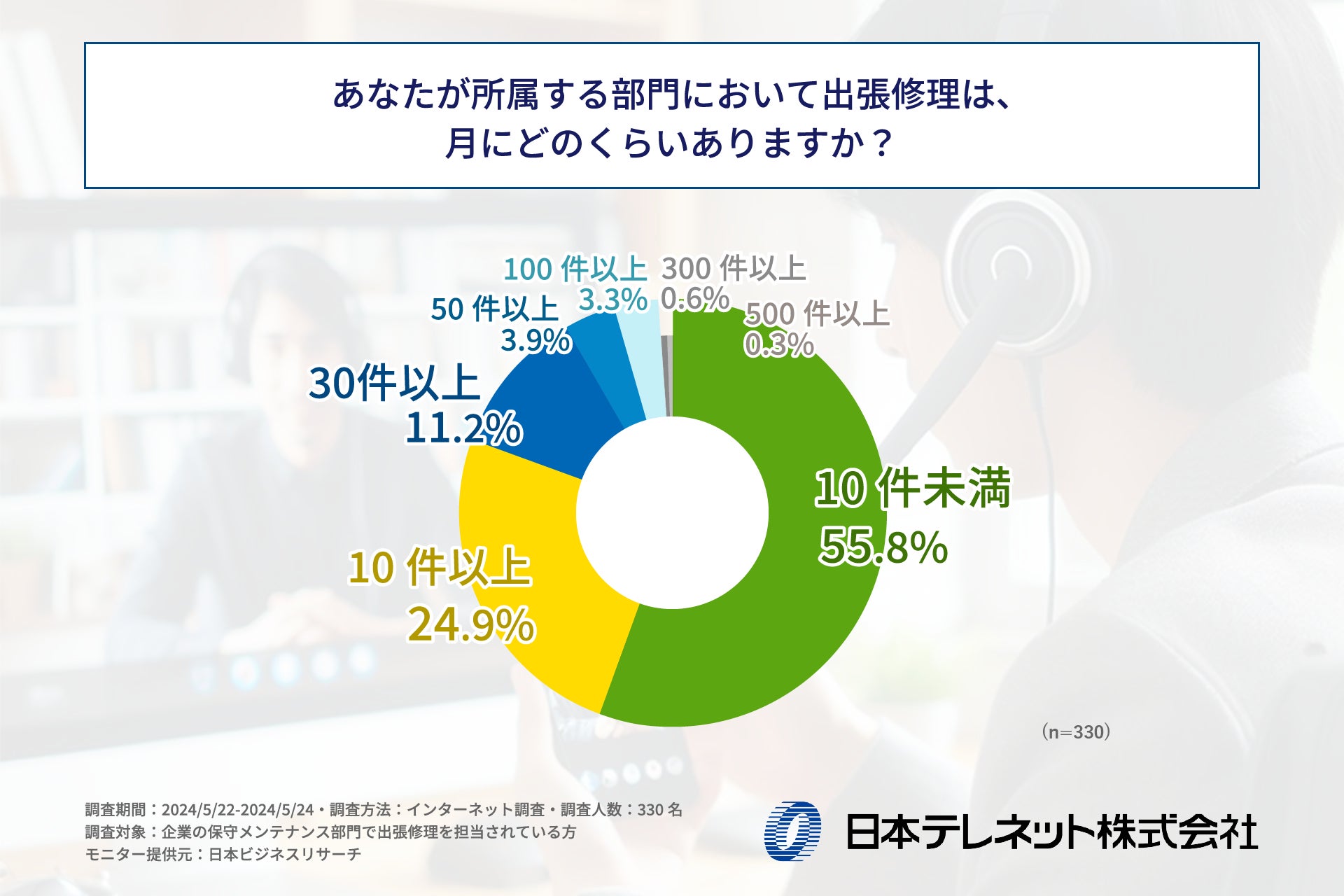 日本テレネット株式会社(本社:京都府京都市、代表取締役会長 兼 社長:瀧 麻由香)は、企業の保守メンテナンス部門で出張修理を担当されている方々を対象に「出張修理の困り事に関する実態調査」を実施しました。