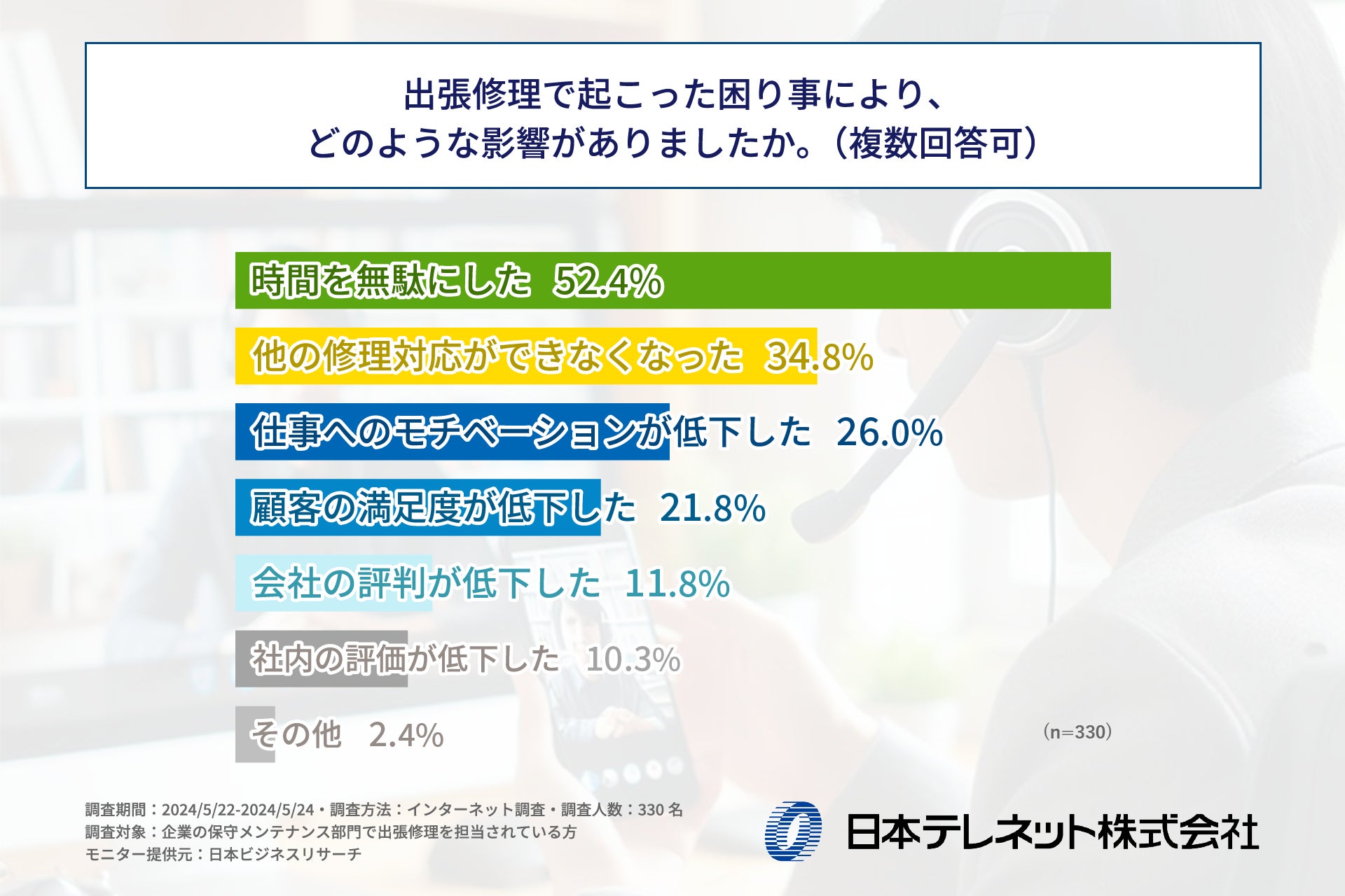 続いて「出張修理で起こった困り事により、どのような影響があったか」を問う設問の回答は、1位「時間を無駄にした(52.4%)」、2位「他の修理対応ができなくなった(34.8%)」、3位「仕事へのモチベーションが低下した(26,0%)」となりました。この結果から、出張修理で起こる困り事は、貴重な時間を浪費させるだけでなく、働く方のモチベーションまで低下させる、ということがわかりました。