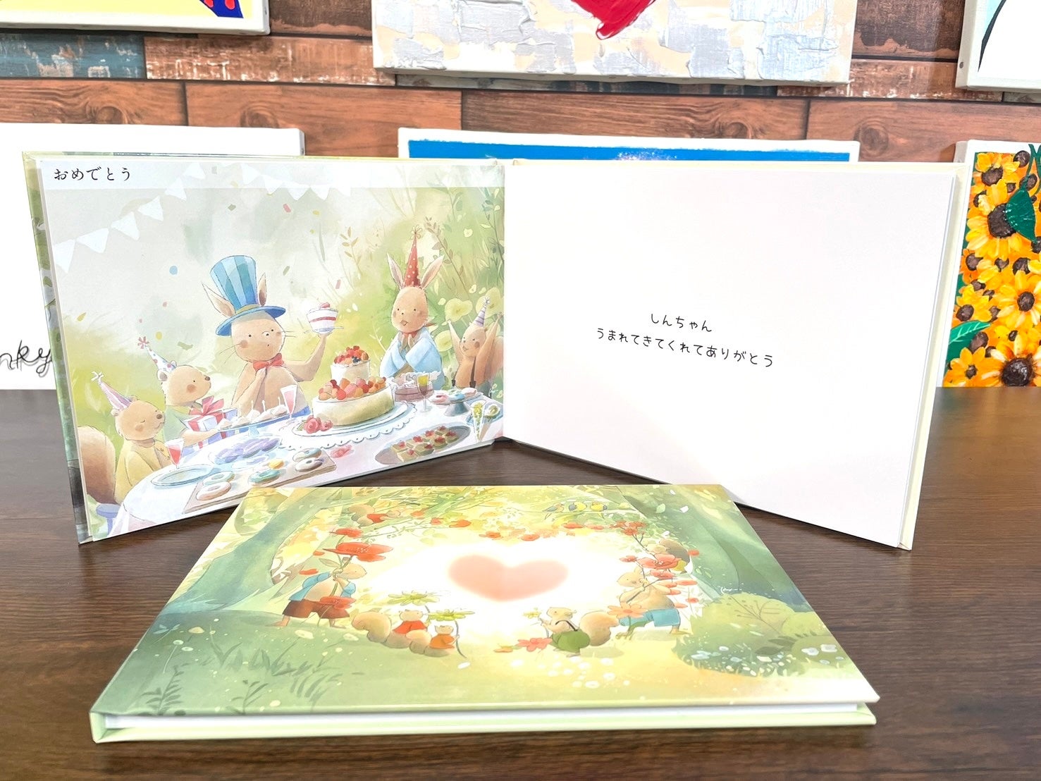 約40種類のイラストからお好きな絵を選び、自由に文章を記入していく仕様となります。特定の物語がある訳でないので、絵本よりも手紙の要素が強いですが、絵本のようにハードカバーにすることで一生カタチに残る「飾れる手紙」となります。