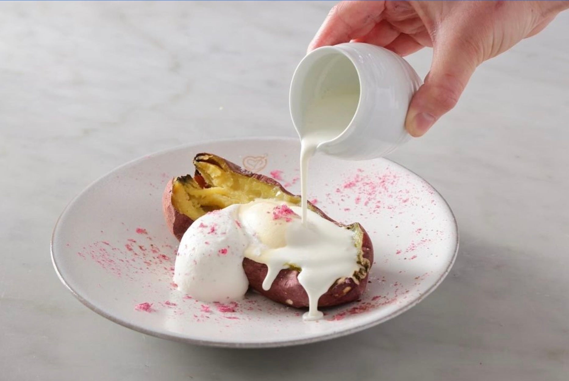 春のメインスイーツは、成澤由浩シェフが織りなす「鹿児島ケンファームの"蜜滴焼き芋" 宮崎県 "尾鈴モルト"杉の香り」です。
