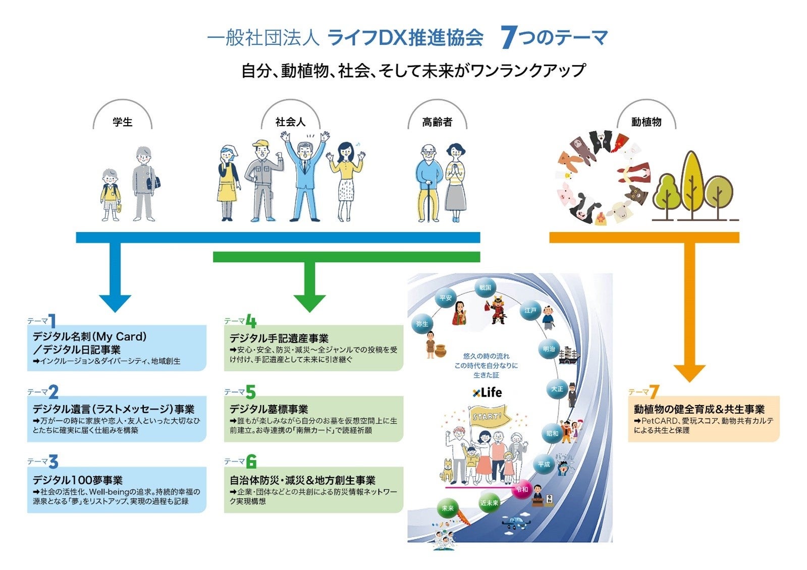 「ライフDX」とは、人間はもとより、あらゆる生き物(ペット、動物、植物)がデジタル技術の恩恵を享受し、個々のQOL(Quality Of Life)の向上と共生を目指すための概念です。一般社団法人ライフDX推進協会(東京都千代田区、代表理事:佐藤孝幸、以下「ライフDX推進協会」)はこのコンセプトを基軸に、さまざまな業界と共創し、7つの事業(別紙参照)を柱に公共性の高いサービスを提供していこうとしています。
