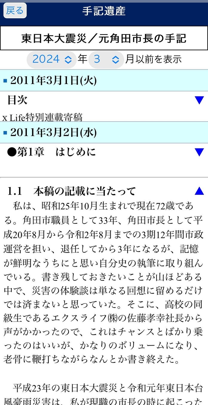 そのうちの1つが、人生経験を通じて得た個々の経験・知見・ノウハウなどをデジタル資産として残し、未来へと継承する「デジタル手記遺産事業」です。その第1弾として、「特集:東日本大震災を繋ぐ」と題して、当時の市町村長(現職を含む)や復興支援活動・調査に携わった大学教授の手記等を、エックスライフ株式会社が提供するライフDXオールインワンWebサービス「xLife(エックスライフ)」上で3月6日(水)より一般公開いたしました。スマートフォンをはじめ、マルチ端末でご覧いただけます。すべて書き下ろしの手記には、いまだからこそ伝えることができる事実やエピソードも含まれており、これらを足懸かりに防災・減災の在るべき姿を探っていただければ幸いです。