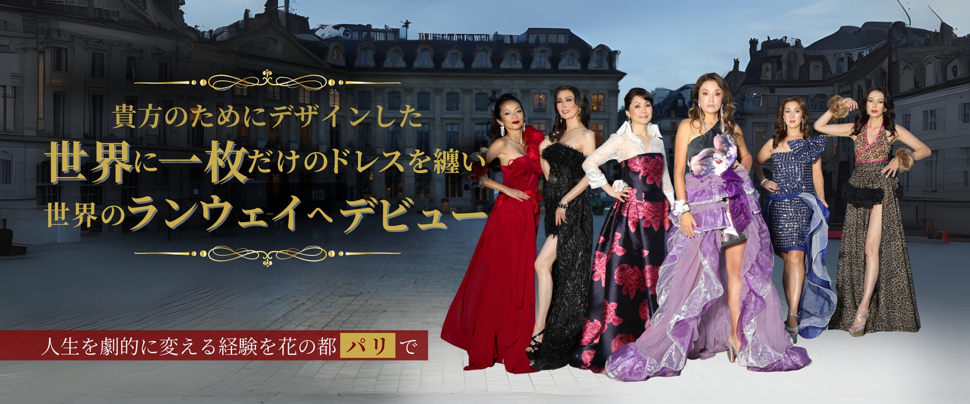 世界にたった1枚の自分のために作られたドレス纏い、JAPANESE TOP MODELとして、パリの一流ホテルでランウェイを歩く特別な舞台をご用意しました。