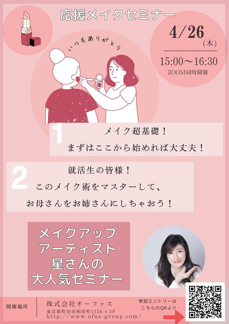 今回、就活生や働いている方向けに、メイクの超基本から無料で学べる「応援メイクセミナー」を4月26日(木)に開催することを決定いたしました。