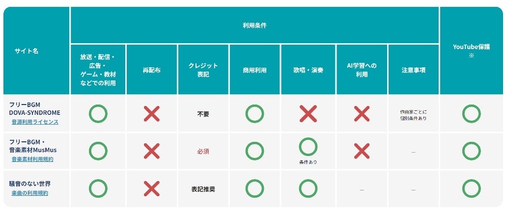 フリーBGM協会が、各フリーBGM配布元の利用規約の違いが一目でわかるフリーBGMサイト紹介ページの運用を開始