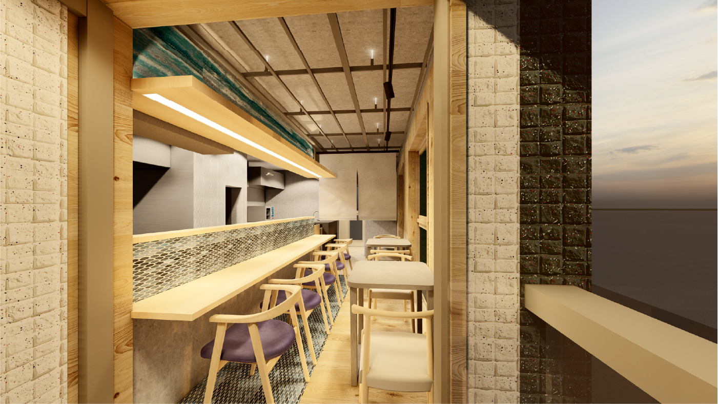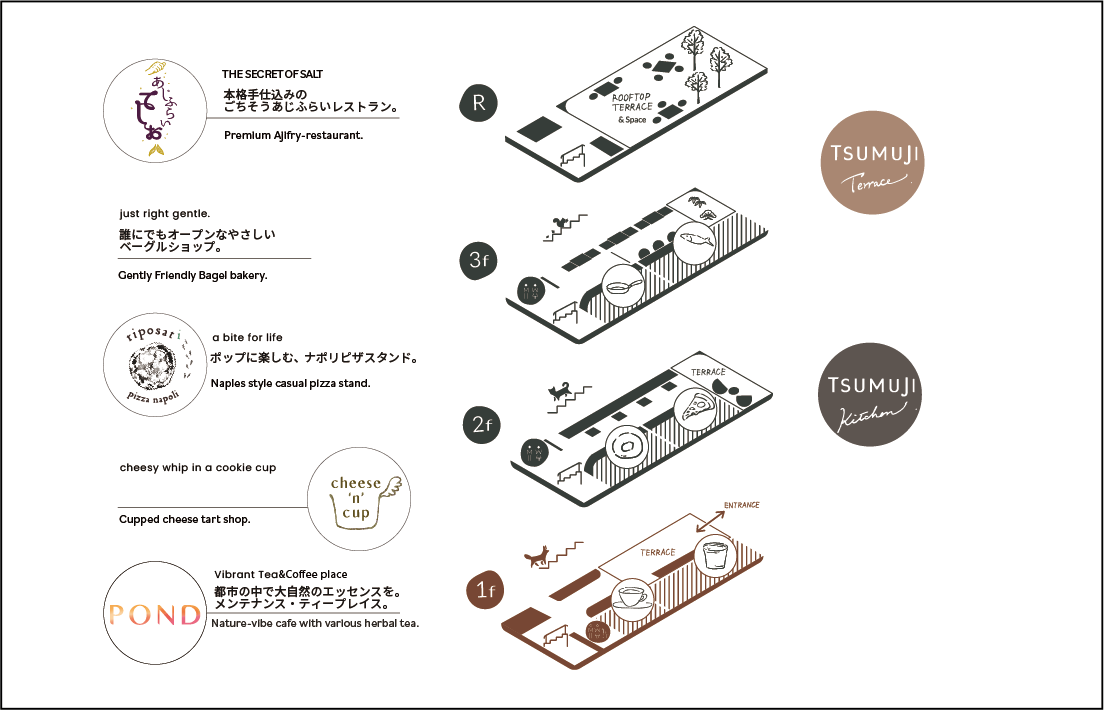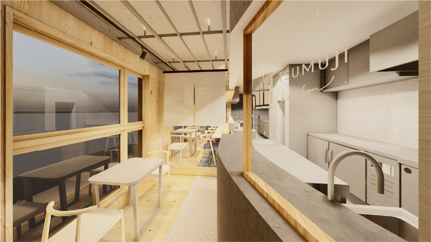 寛大でオープン、人間味があってチャーミング。人柄そのものをこの施設のキャラクターにしようと思った。加えて、寺町というロケーション、氏が代表を務める、株式会社Japan Foods Systemが駅弁の流通販売をベースに発展してきたことなどから、デザインベースは「和」に。そして、TSUMUJIという名称は、日本古来の言葉、路が十時に交わる場所、辻、から名付けられた。食がテーマのこの施設で、食を介して人が出会い、何かを生み出される場所となるようにというテーマを表しているのだという。