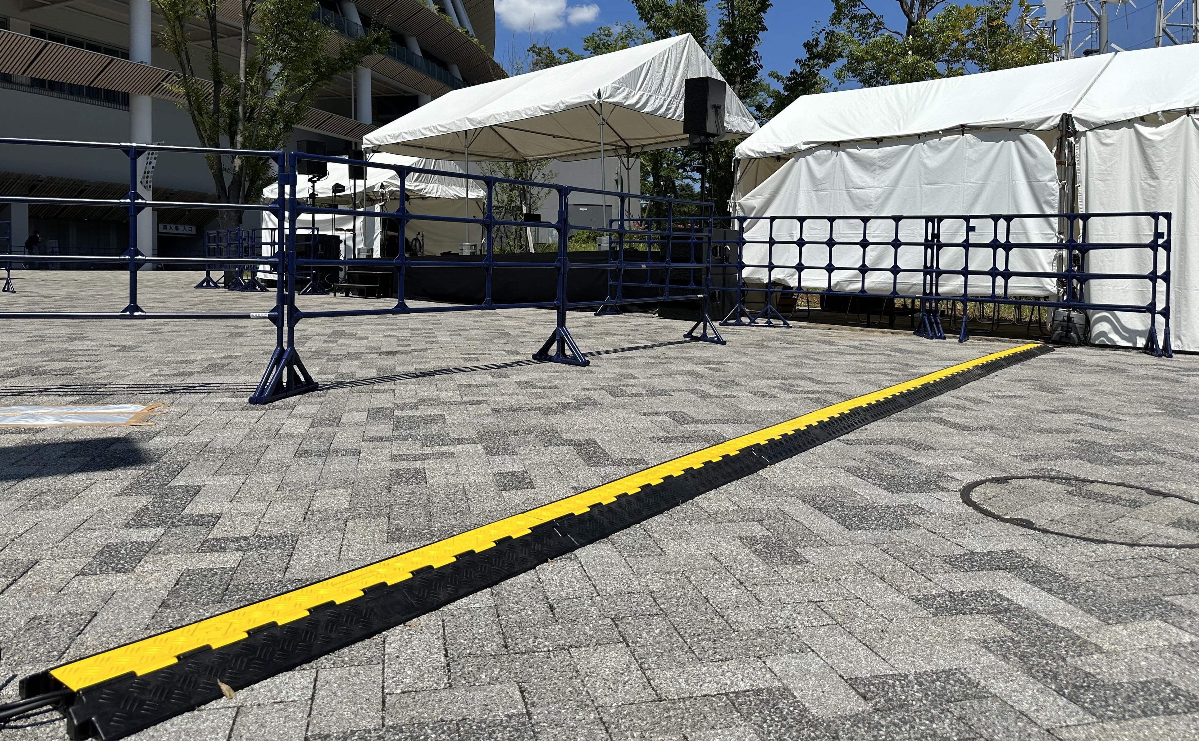 強化型ケーブルプロテクターどこでもケーブルは、大型トラックが載っても壊れない高い耐久性を持ち、さまざまな工事現場やイベント会場にてケーブルを車両や歩行者から保護します。