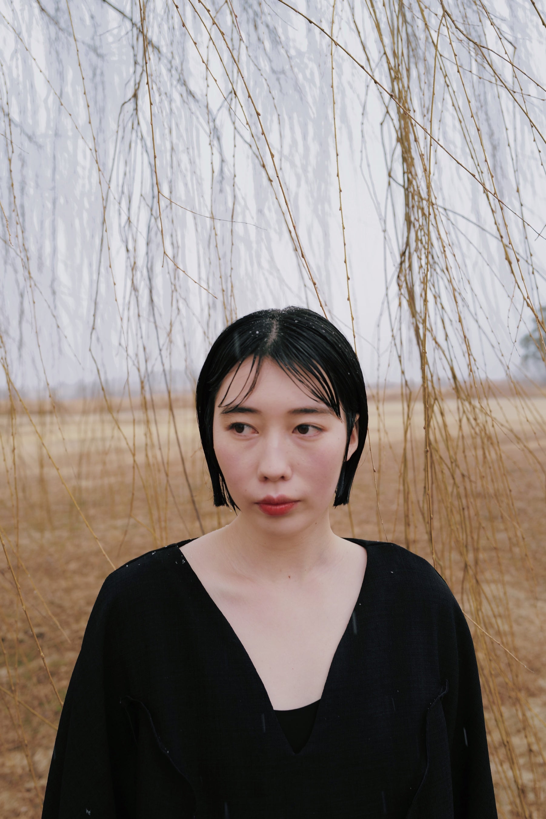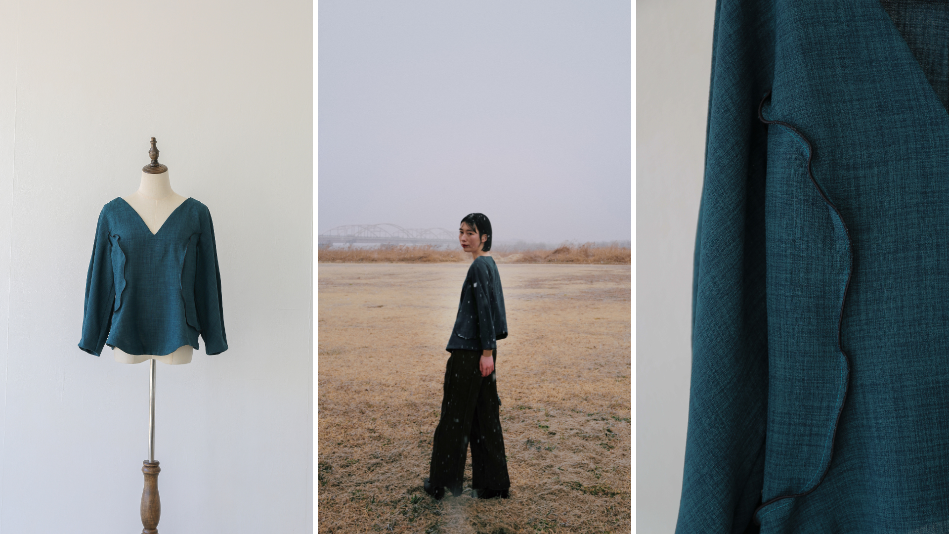 休日のある日。渓谷沿いをドライブしてふと迷い込んだ山奥の集落。枯れ木の隙間からぼやっと奥に見える鮮やかに透き通った渓流のブルー色の描写を落とし込んだ1着。