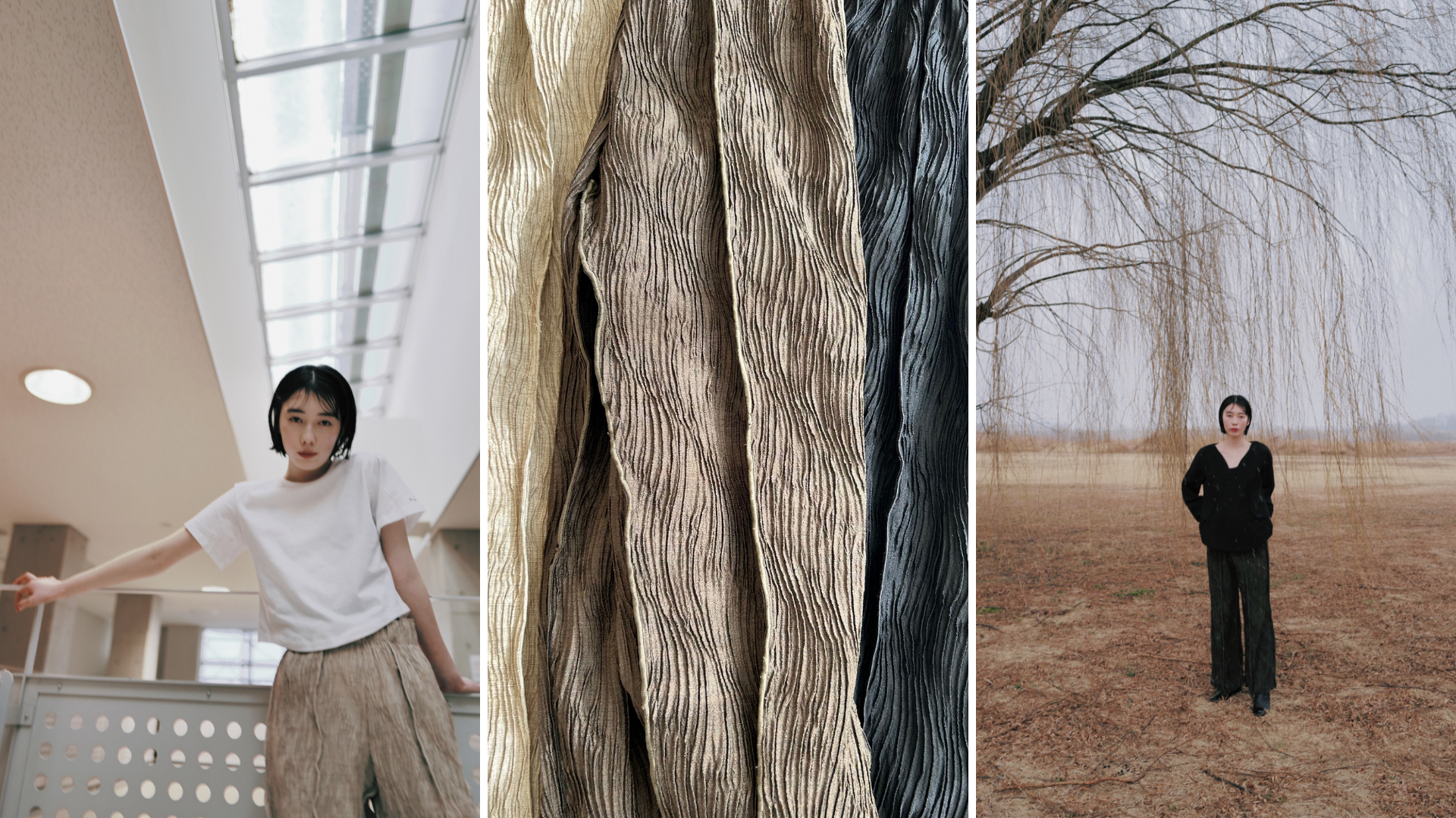 樹木表面の柔らかく力強さのあるテクスチャーを表現。横方向に伸縮の良い特殊な織物を使用しています。動きやすく、身体を締め付けすぎないので日常使いにおすすめなアイテムです。