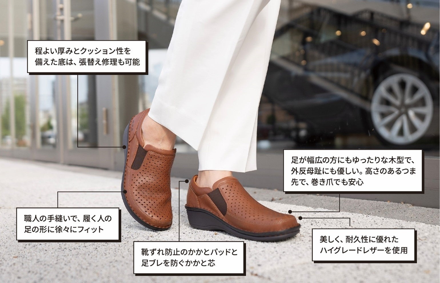 H.P.S.の靴は、デザインする際、外反母趾・内反小趾の関節部を圧迫しないよう、切り替えやステッチを入れない工夫をしています。踵周りには固めの芯が入っており、左右の足ブレを防ぎます。また、人気のパンチングの革を使ったシリーズは、足の動きに応じたストレッチ性がより高く、ストレスの少ないデザインです。鹿革シリーズも、伸びのある非常に柔らかい革で、人気があります。