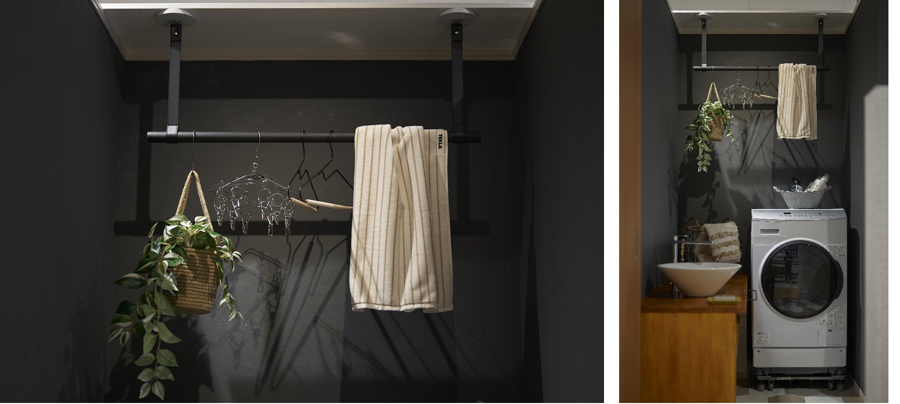 賃貸OK!原状回復可能な、室内用物干し。部屋に洗濯物が干されているだけで生活感が溢れてしまったり、賃貸で物干しやラックを置くスペースがなかったり。そんなDIYerなつこ自身や周りからのお悩みを受けて、「賃貸でも使える美しい物干しがつくりたい」とうまれた商品です。天井から吊るす物干しで、足元の空間もすっきり有効活用可能です。取り付けは賃貸でも施工が安心な石膏ピン。耐荷重は16Kgまで可能となっています。(16kgの目安:5人家族の1日の洗濯物)