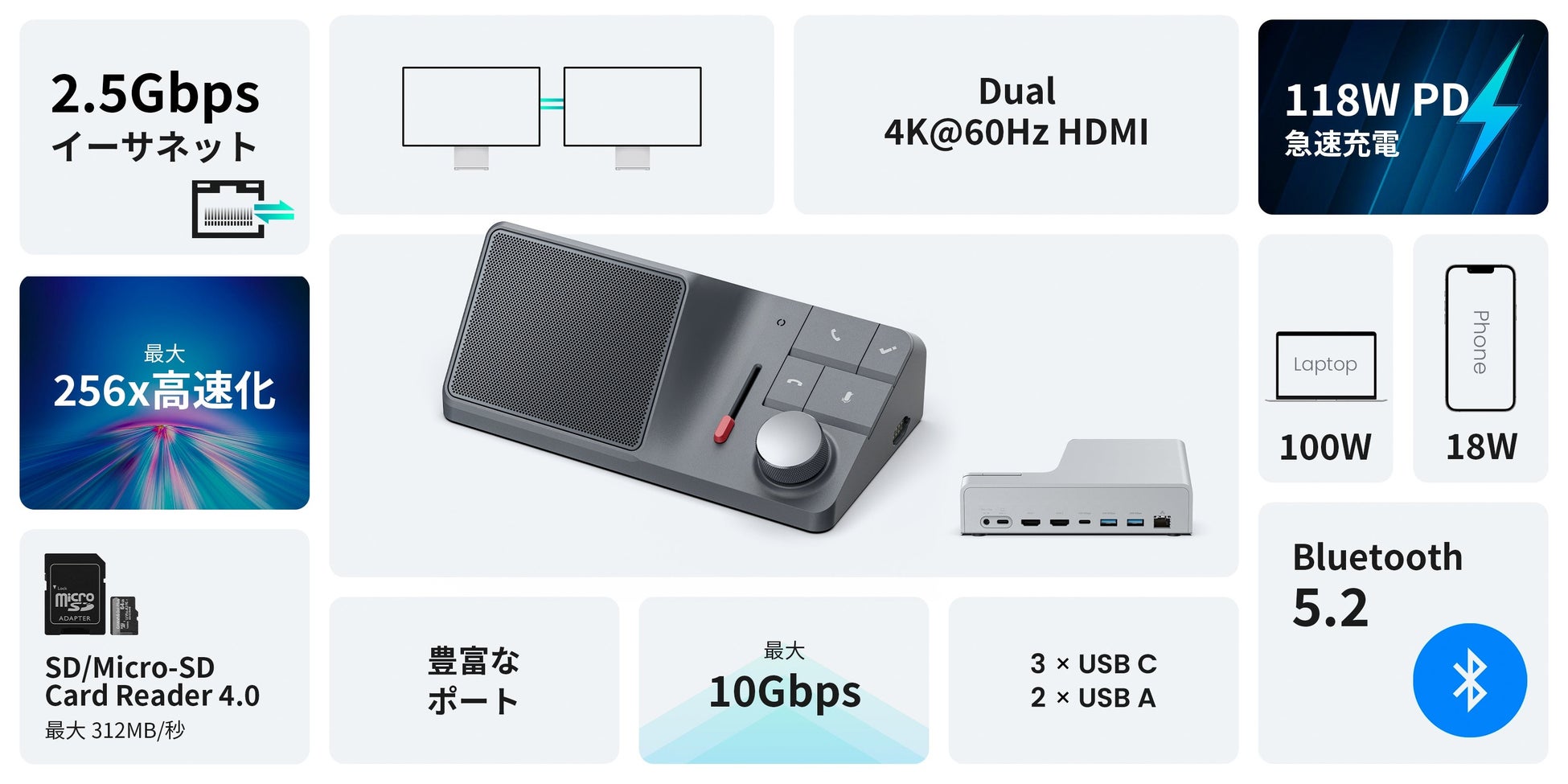 HDMI v2.0 (4K@60Hz) x 2 2.5Gbps インターネット x 1 micro SD 4.0 (UHS-II) x 1 SD 4.0 (UHS-II) x 2 USB-C 3.2 Gen 2 (10Gbps) x 1 USB-C 3.2 Gen 2 (10Gbps) with up to 18W charging x 1 USB-A 3.2 Gen 2 (10Gbps) x 1 USB-A 3.1 Gen 1 (5Gbps) x 1 DC電源(20V, 7.5A) x 1 USB-C アップストリーム x 1 |