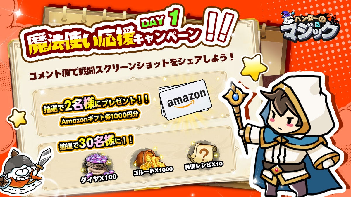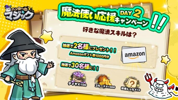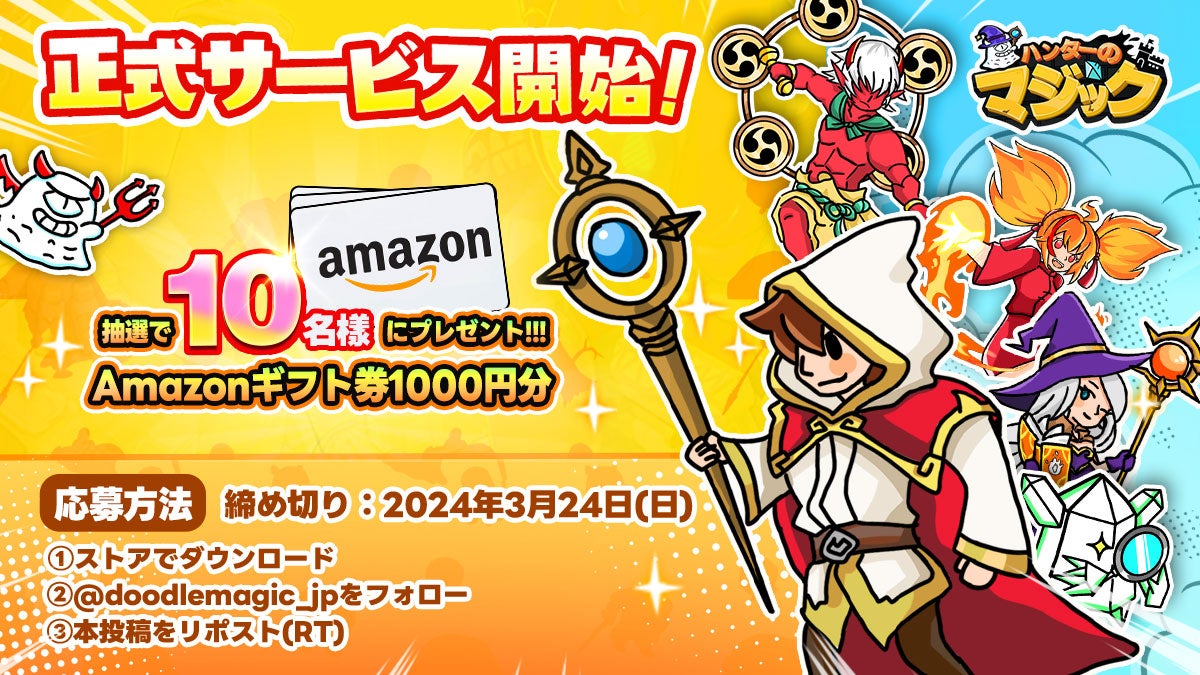 正式サービス開始を記念して、公式X(@doodlemagic_jp)にて「魔法使い応援キャンペーン」を3月22日(金)から3月26日(火)まで、5日間連続で開催することが決定しました。対象ポストの応募方法に従って応募いただいた方の中から抽選で毎日2名様にAmazonギフト券1000円分、30名様にダイヤx100個、ゴールドx1000枚、装備レシピx10枚をプレゼントいたします!