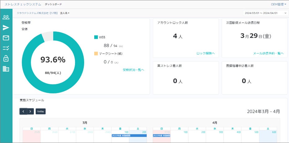 「どこでもストレスチェック」は、経営コンサルティング企業や産業医サービス向けにストレスチェックシステムのOEM提供を行っており、特に要望が多かった【複数の企業の実施状況を一覧管理する機能】も合わせて提供します。【実施中企業の実施率】、【高ストレス者数】、【勧奨メールの送信スケジュールの確認】ができる様になることで、クライアント企業の円滑な実施サポートを可能にします。