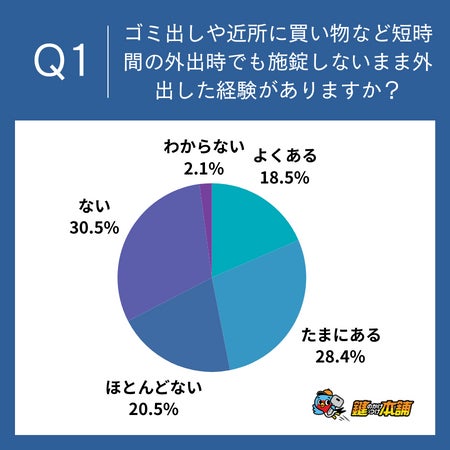 短時間の外出で施錠しないまま外出した経験が、よくあると回答した人が18.5%で、たまにあると回答した人が28.4%でした。およそ5割の人が鍵を施錠しないまま外出した事があると回答しました。。