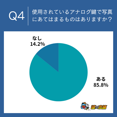 アナログ鍵を使用している人のうち、85.8%がピンシリンダー型かディスクシリンダー型を使用していると回答しました。なお、ピンシリンダー型、ディスクシリンダー型の鍵は、セキュリティに懸念があるとされる鍵型です。