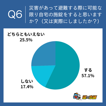 災害にあった際に自宅を施錠すると回答した人が57.1%と最多でした。次いで25.5%の人がどちらとも言えないと回答しました。