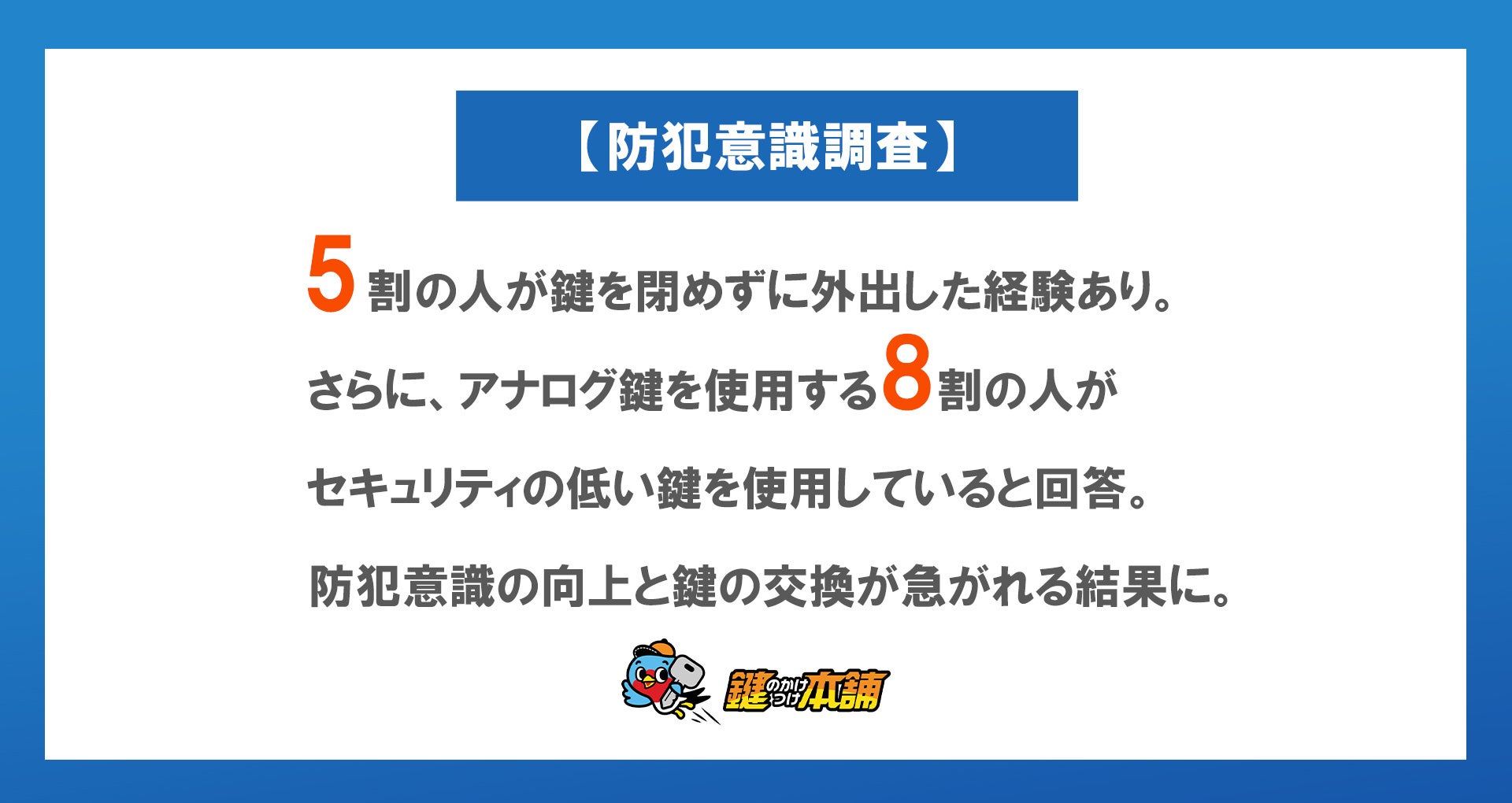 【防犯意識調査】5割の人が鍵を閉めずに外出した経験あり。さらに、アナログ鍵を使用する8割の人がセキュリティの低い鍵を使用していると回答。防犯意識の向上と鍵の交換が急がれる結果に。