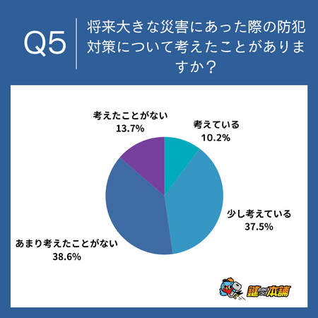災害時の防犯意識については、52.3%の人が大きな災害にあった際の防犯対策について考えていない、またはあまり考えていないと回答し半数を上回りました。災害にあって避難する際に施錠すると思いますか?の問いには42%の人がしない、またはどちらとも言えないと回答しました。日常生活の防犯対策だけでなく、災害時の防犯意識の向上が求めらえる結果となりました。