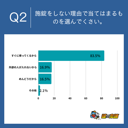 次に施錠をしない理由として、「すぐに帰ってくるから」が83.5%で最多となりました。次いで「外部の人が入れないから」が16.9%、「めんどうだから」が16.5%でした。