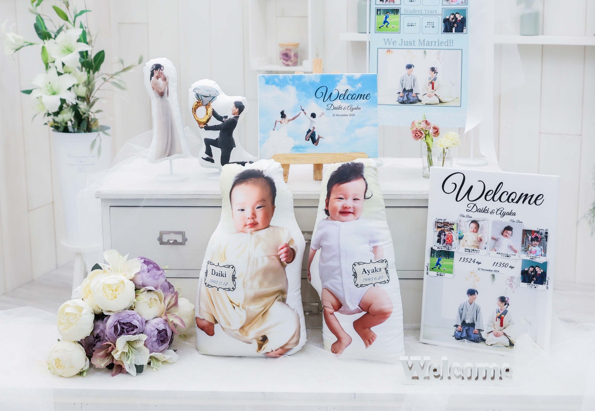 「ウエディング ウエイトクッション」は、新郎新婦が生まれた時の体重と同じ重さで作られる特別なクッション。やさしい肌触りと高級感のあるデザインが特徴で、結婚式の贈呈品として多くのカップルから支持を集めています。