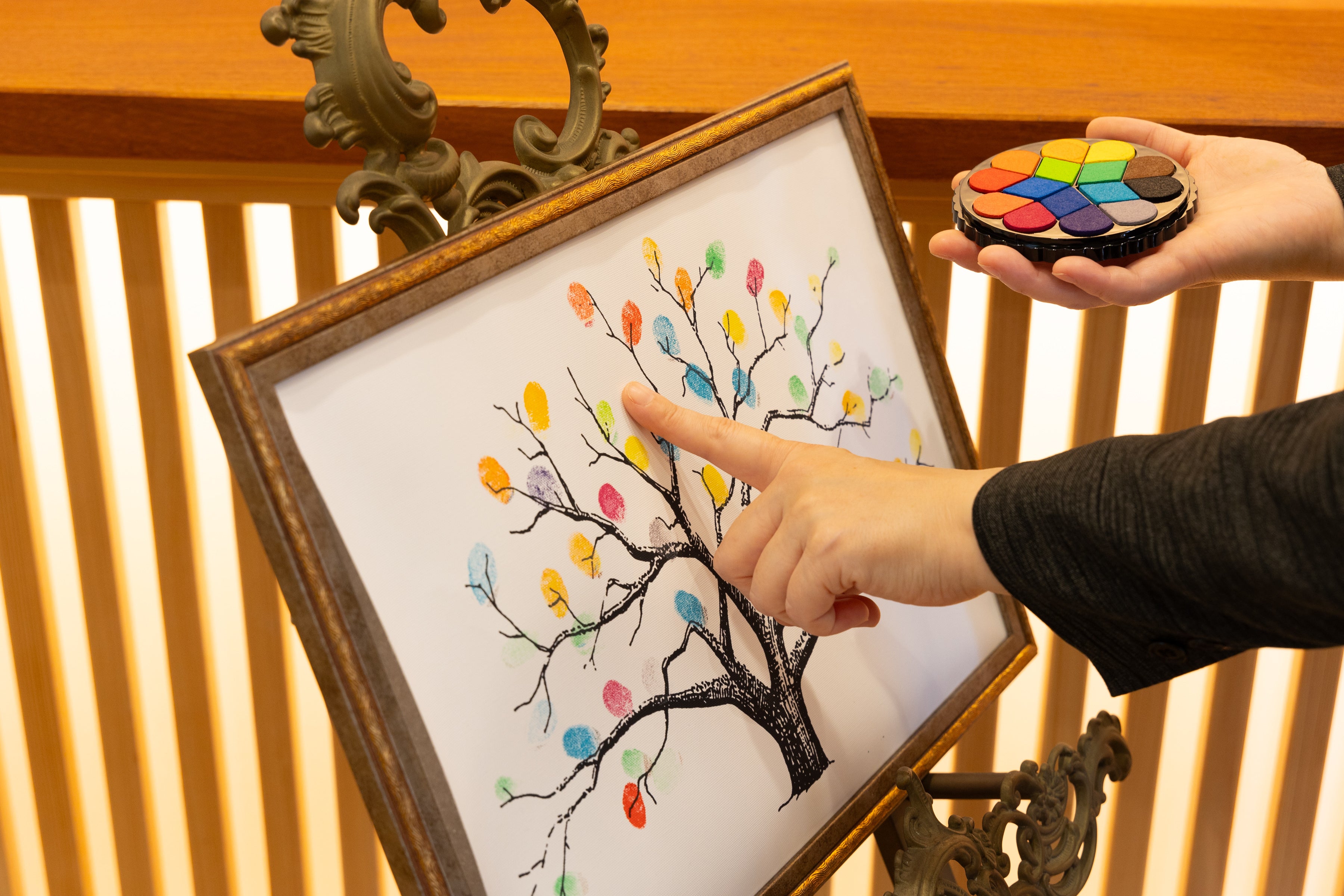 まず式場入口には、感謝の気持ちを込めて来場者をお迎えしようと、フィンガーアートによるフェアウェルボードを設置しました。入口から控室の3カ所に置かれたファミリーツリーには、中に進むにつれて職場、親族、家族と徐々につながりが濃くなっていく写真が飾られ、祭壇は棺の周りにお花を設えたものと、感謝の気持ちを象徴したハート型の2パターンがデザインされました。棺を囲うように椅子が並べられ、壁にはお花の作品も飾られました。フラワーセレモニーでは、オレンジとイエローで揃えた花々をハートモチーフの型枠に献花しました。最終的に故人とつなぐ「絆」を形にしたアレンジメントとして完成し、リビングの中央に設置されました。