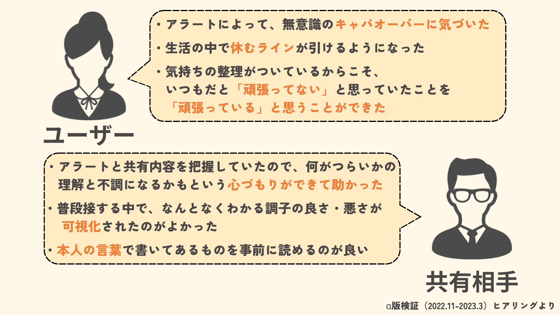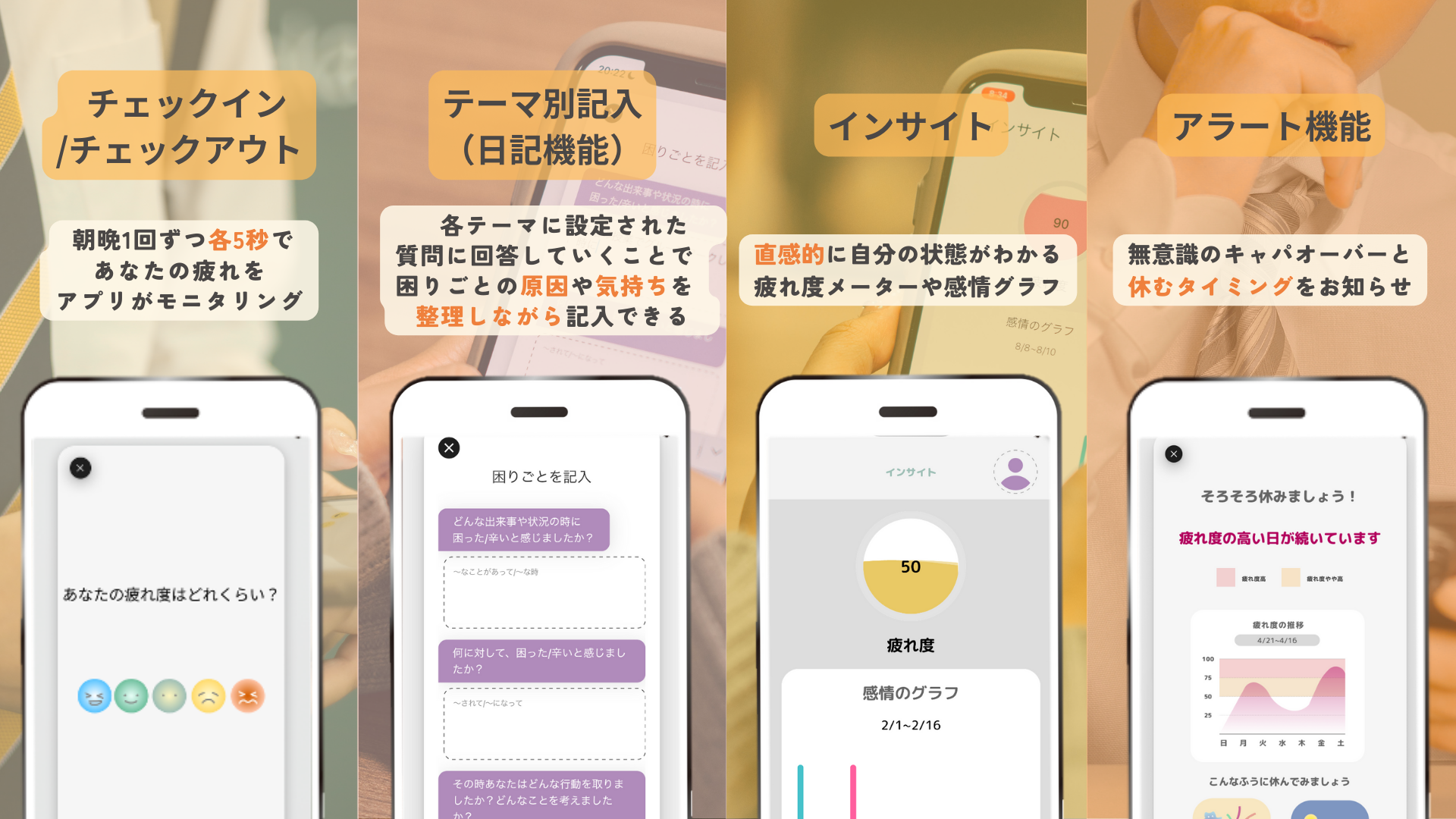 ユーザーの入力から、自分で”気付きにくい”疲れや、周囲から”見えにくい”生活の中での頑張り”を察知し、疲れが溜まってきたタイミングでアプリが「そろそろ休んで!」とお知らせします。