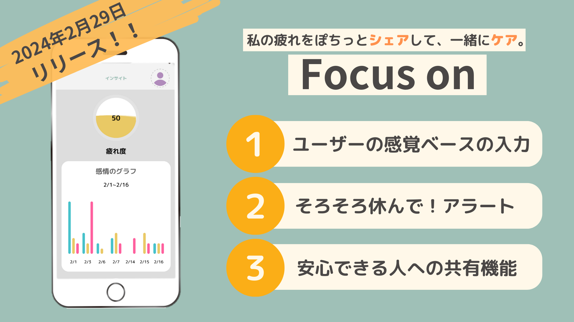 Focus onとは、目に見えない疲れを可視化し、ユーザーの安心できる人のもとにユーザの状況を"共有する"セルフケアアプリです。