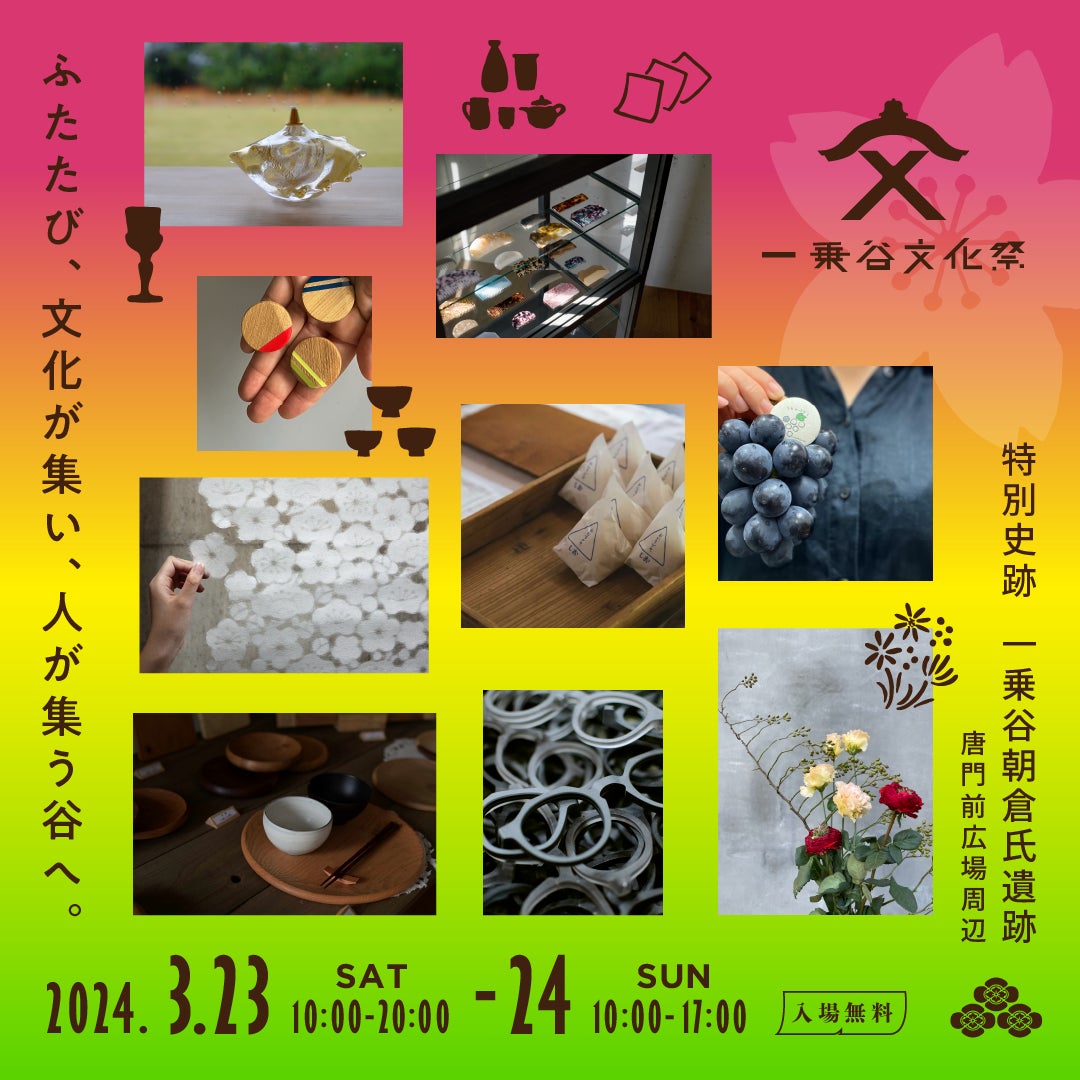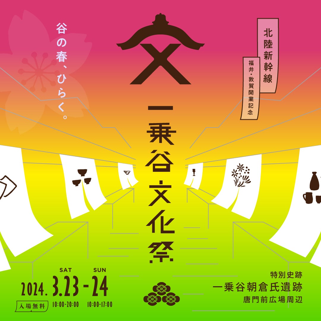 福井県デザイナー協会がプロデュースするイベント「一乗谷文化祭」を3月23日(土)24日(日)に一乗谷朝倉氏遺跡・唐門前広場周辺で開催します。福井市にある一乗谷朝倉氏遺跡は、戦国時代の城下町全体が遺跡となって残された、全国でもまれな大規模遺跡です。約100年間、戦国大名朝倉氏の城下町として栄えた一乗谷には、北ノ京とも言われる豊かな文化がありました。 食文化、まちづくり、ものづくり、建築や芸能 ... 発掘調査によって次々と明らかになった当時の暮らしに学び、 今ふたたび、さまざまな文化が谷へ集います。里山の芽吹きが美しい春の一乗谷で、 当時の賑わいに思いを馳せる1日をお過ごしください。