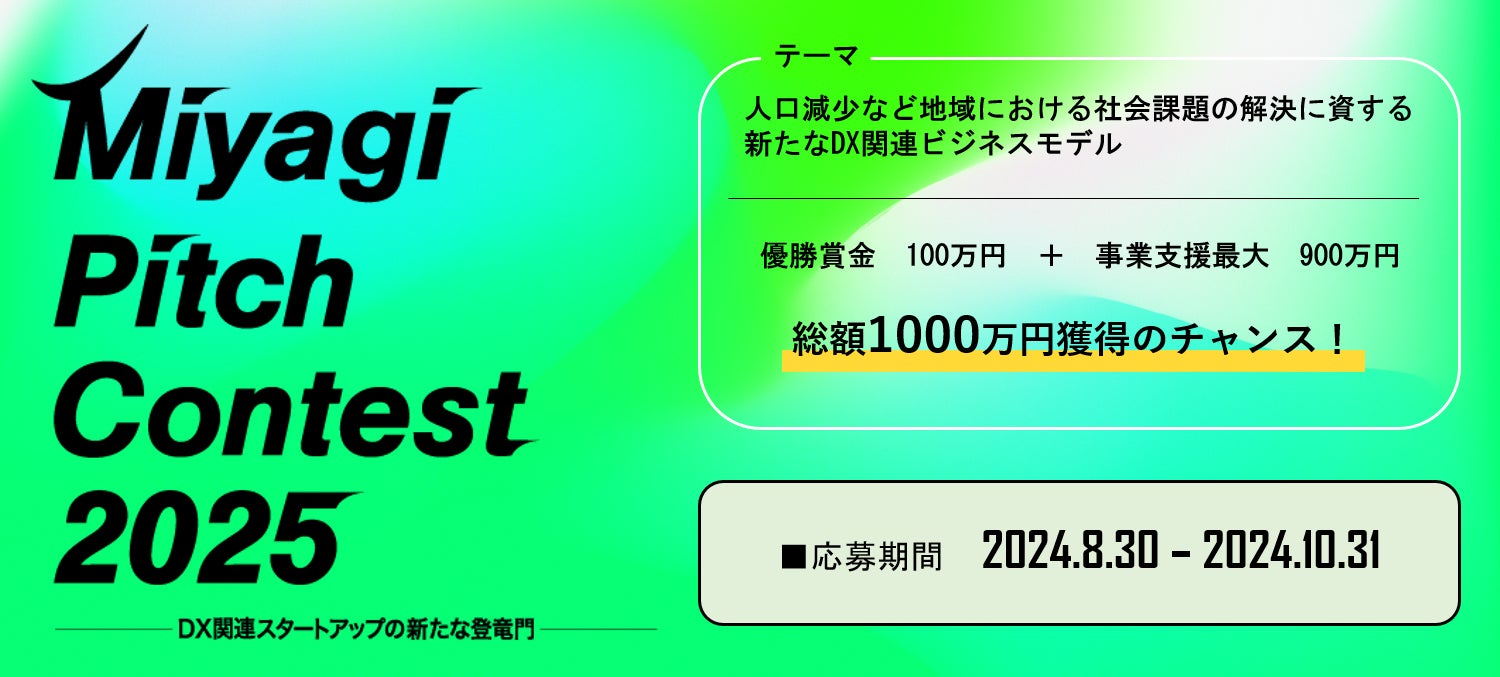 宮城県では、アントレプレナーシップが旺盛でDX 関連の新たなプラン・サービスに挑むスタートアップと、その活動を応援する方々が一堂に会して創発し、大きく羽ばたいていただくことを期待し、昨年度に続き「Miyagi Pitch Contest 2025」を開催します。
