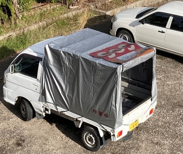 日常時は壁面装飾のほか軽トラックシートとして、発災時は日常時に使っている面を裏返して軽トラックのそばから災害情報を知らせたり、公園やグラウンド、屋上などにシートを移動させたりして、救援情報を上空の救助者へ届けることができます。