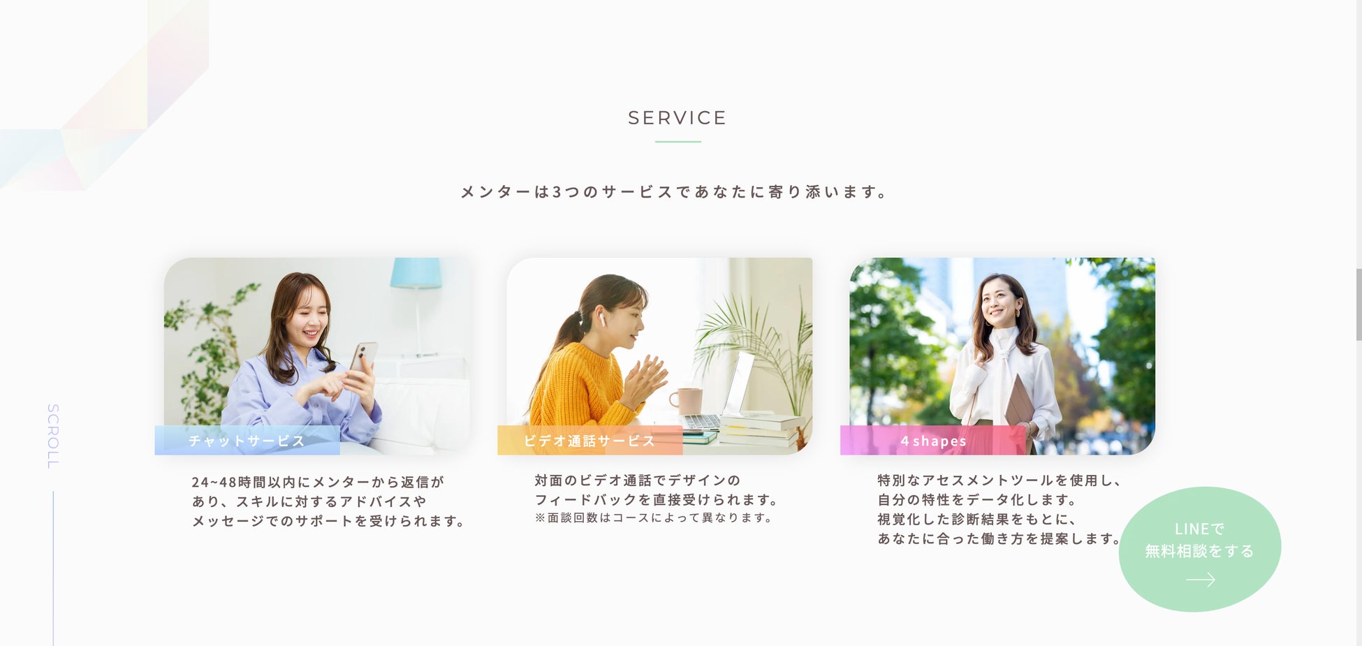 入会時に4Shapes®という認知特性診断アセスメントを受けてもらい、その結果をもとにメンタリングを行います。面談では、現在の困りごとを聞きアドバイスを行うのはもちろんですが、今後のキャリア形成に向けたアドバイスも行います。目の前の案件を定期案件にしたり、紹介をつなげたり、案件がないと不安にある状況から脱却し、自ら仕事を選べるデザイナーまで育成をします。