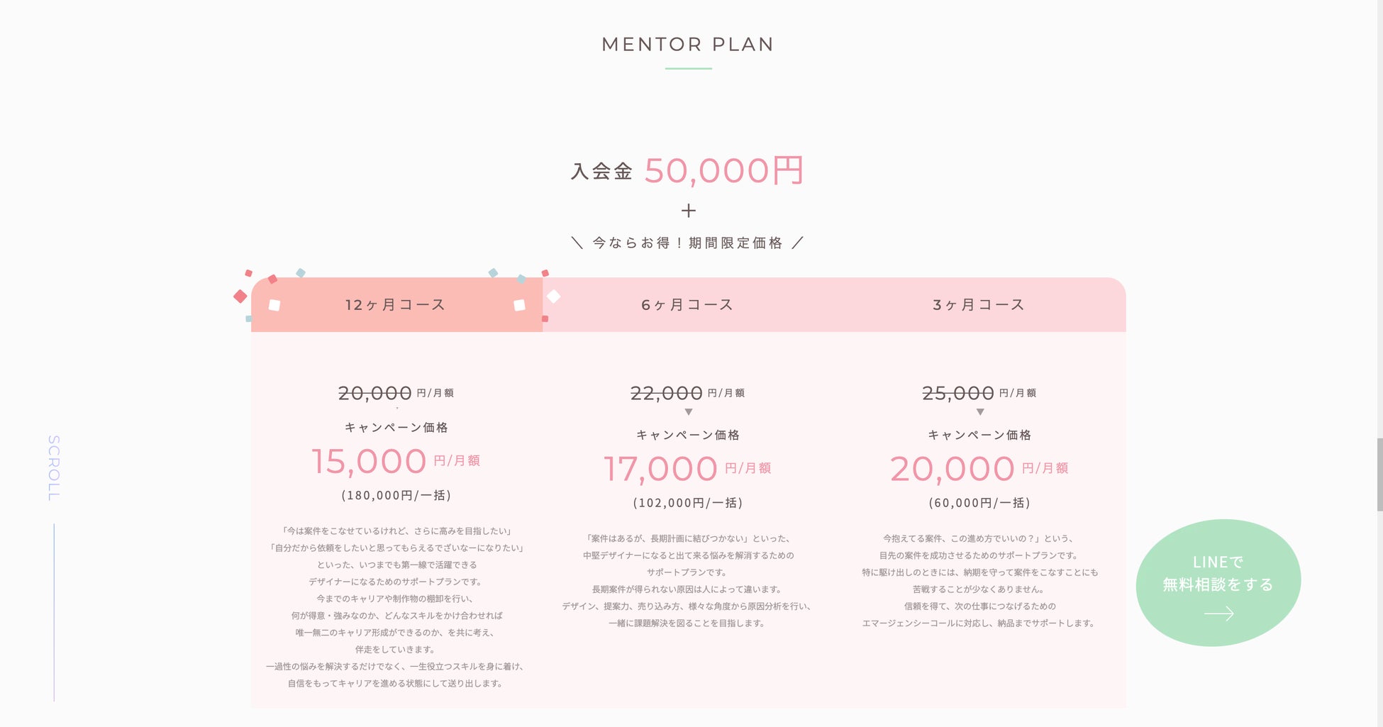 ・12か月コース(入会金:50,000円、月あたりの受講料:15,000円)