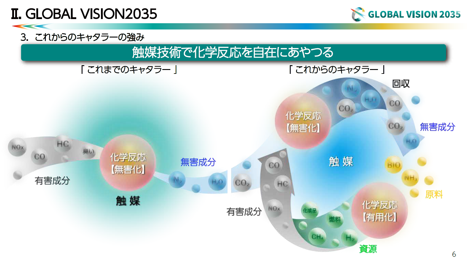 当社では、GLOBAL VISION2035を新たに策定し、新たなビジネス領域を「資源・エネルギー問題を解決する技術」と定めました。当社がこれまで培ってきた排出ガス浄化触媒による浄化・無害化の技術をさらに一歩進ませ、資源化や利活用にまで化学反応のループを回し、循環型社会、脱炭素社会の実現に貢献していきます。