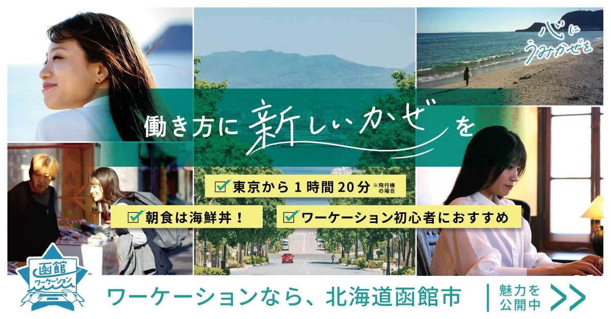 「函館ワーケーション(休暇型編)」のプロモーション動画を公開しました。今回公開した動画のテーマは「⼼にうみかぜを」です。東京で⽣活するOLが函館市でのワーケーションを通じて、美しい景観や⼈と⼈の繋がりを通じて、リフレッシュする姿が描かれています。