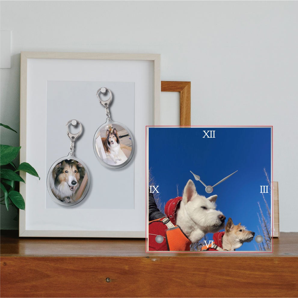 お家の雰囲気を崩さない質感になるように、アクリル特有の透明感が活きた鮮明なプリントでうちの仔のオリジナルグッズをお作りいただけます。