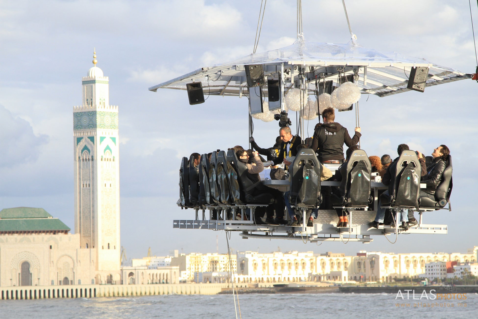 クレーンを使用し、テーブルと椅子が地上40メートルまで吊り上げ、空中にレストランスペースを維持します。