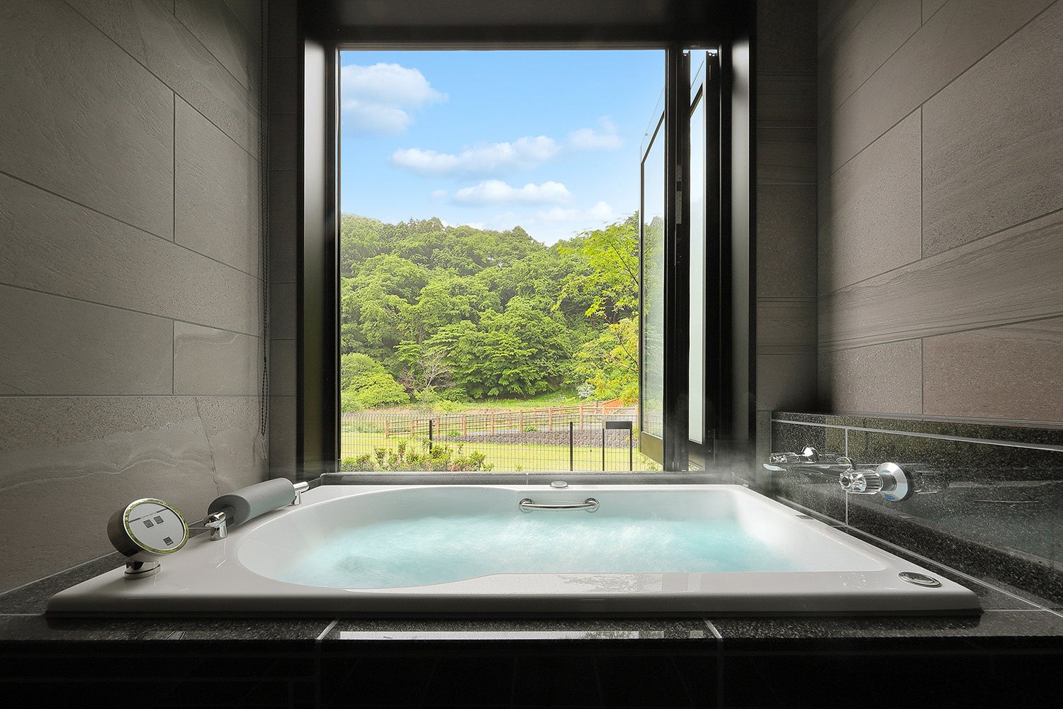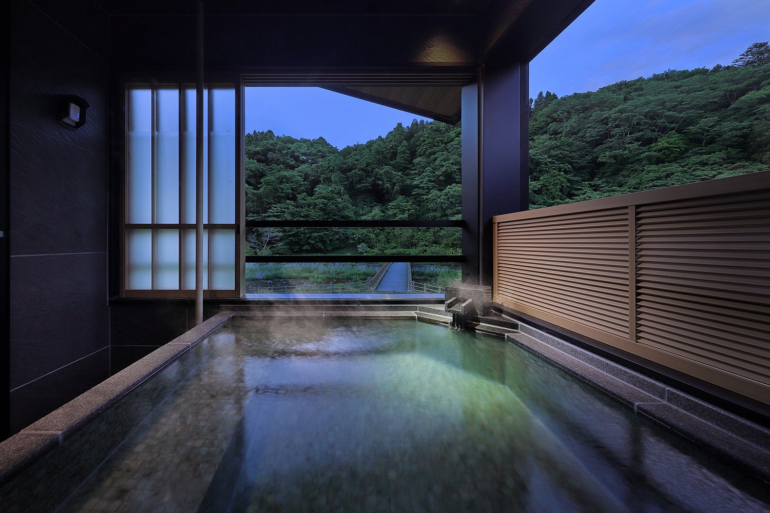 2Fには窓を開けて湯浴みが楽しめる、源泉かけ流しの半露天風呂の他、ガラス越しに上塩原の景色を望む、プライベート岩盤浴もご用意いたしました。⽬覚めたての朝⾵呂や、おやすみ前のひと⾵呂など、憧れのバスタイムをいつでも気軽にお楽しみください。