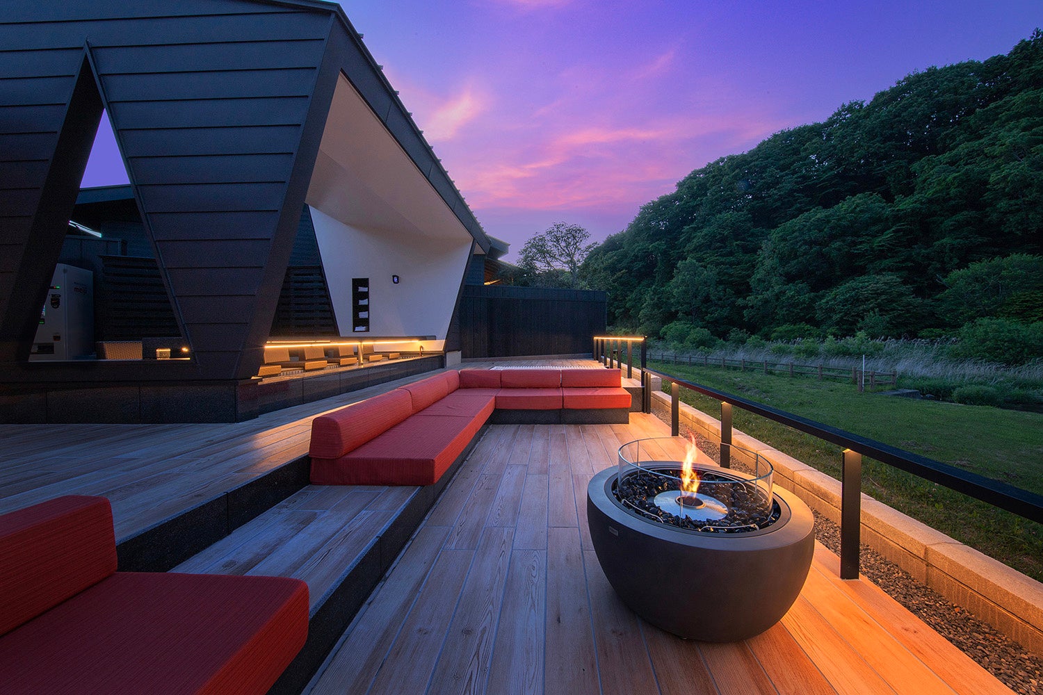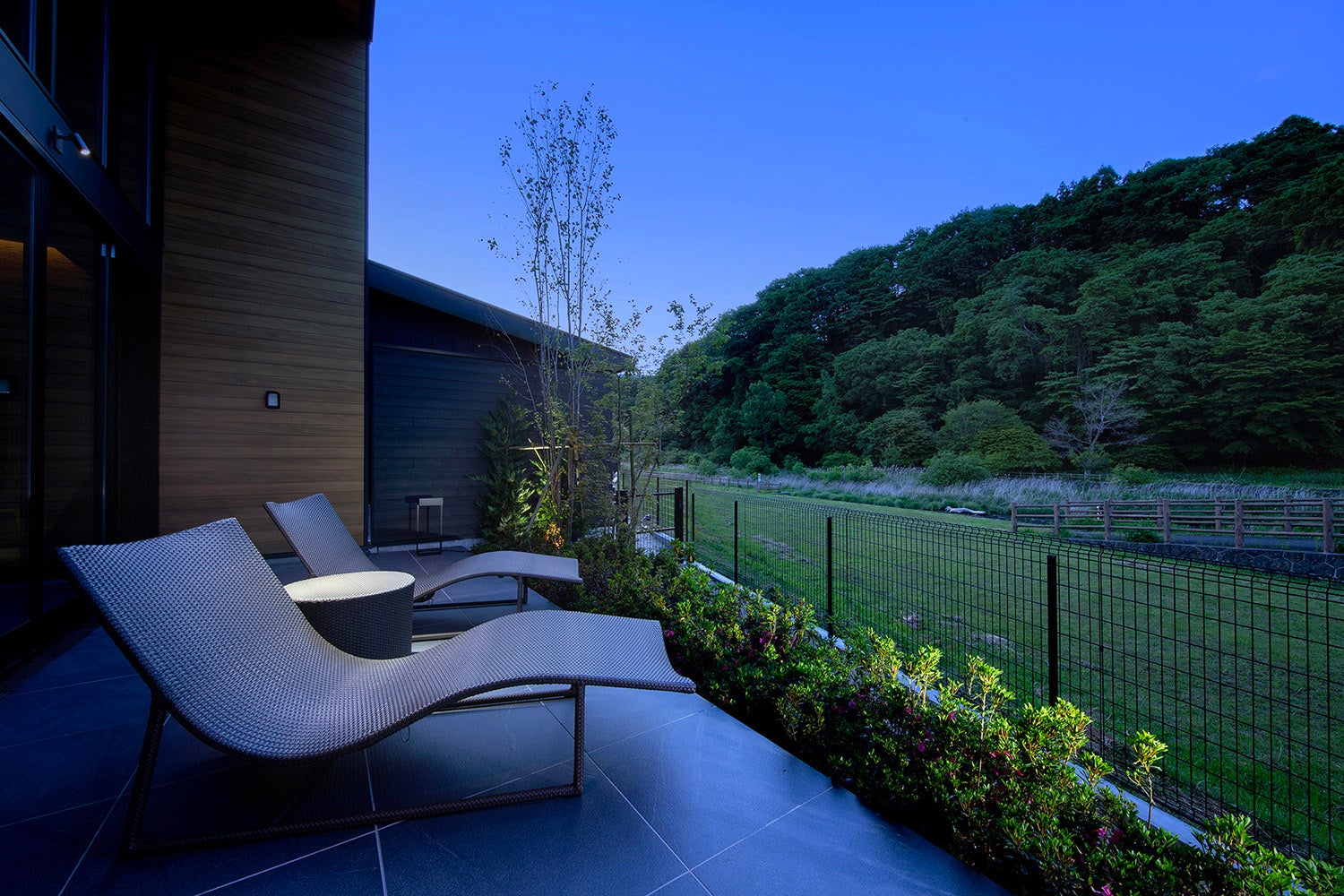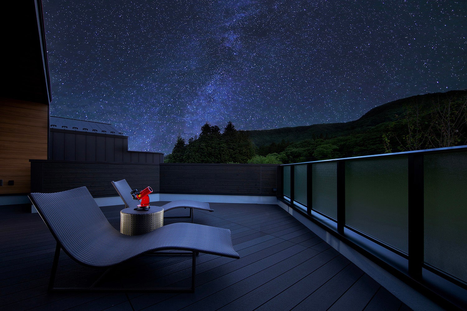 2Fの寝室から続く空間には、贅沢なまでの広さを誇る空の特等席“星見テラス”をご用意。これまで多くのお客様から感動の声を頂戴してきた当地、上塩原自慢の星空の美しさを、よりプライベート感たっぷりにお楽しみいただけます。星空観察用の天体望遠鏡は、お部屋にご用意しております。もちろん読書やお昼寝、サウナの“ととのい場” など、滞在中のアウトドアラウンジとしても活用自在です。